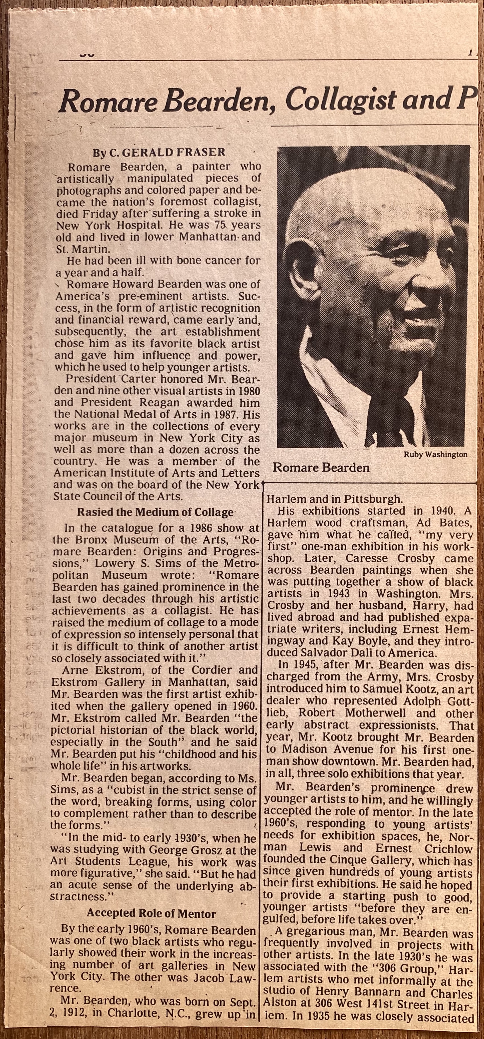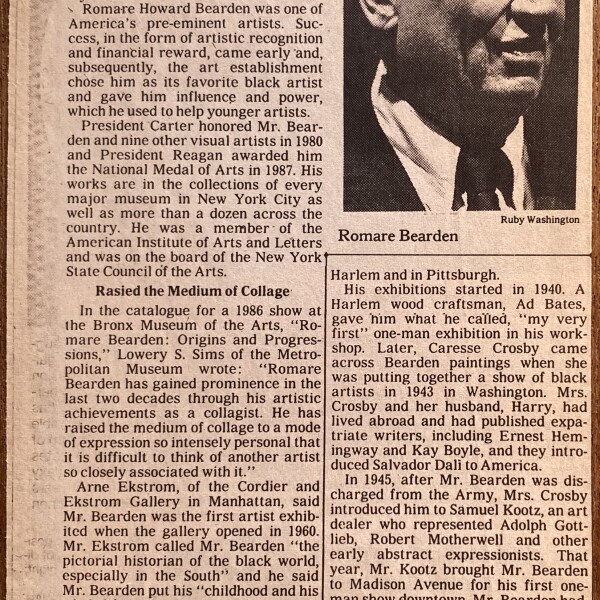 (Romare Bearden). C. Gerald Fraser. Romare Bearden, Collagist and Painter Dies at 75. The New York Times. March 13, 1988