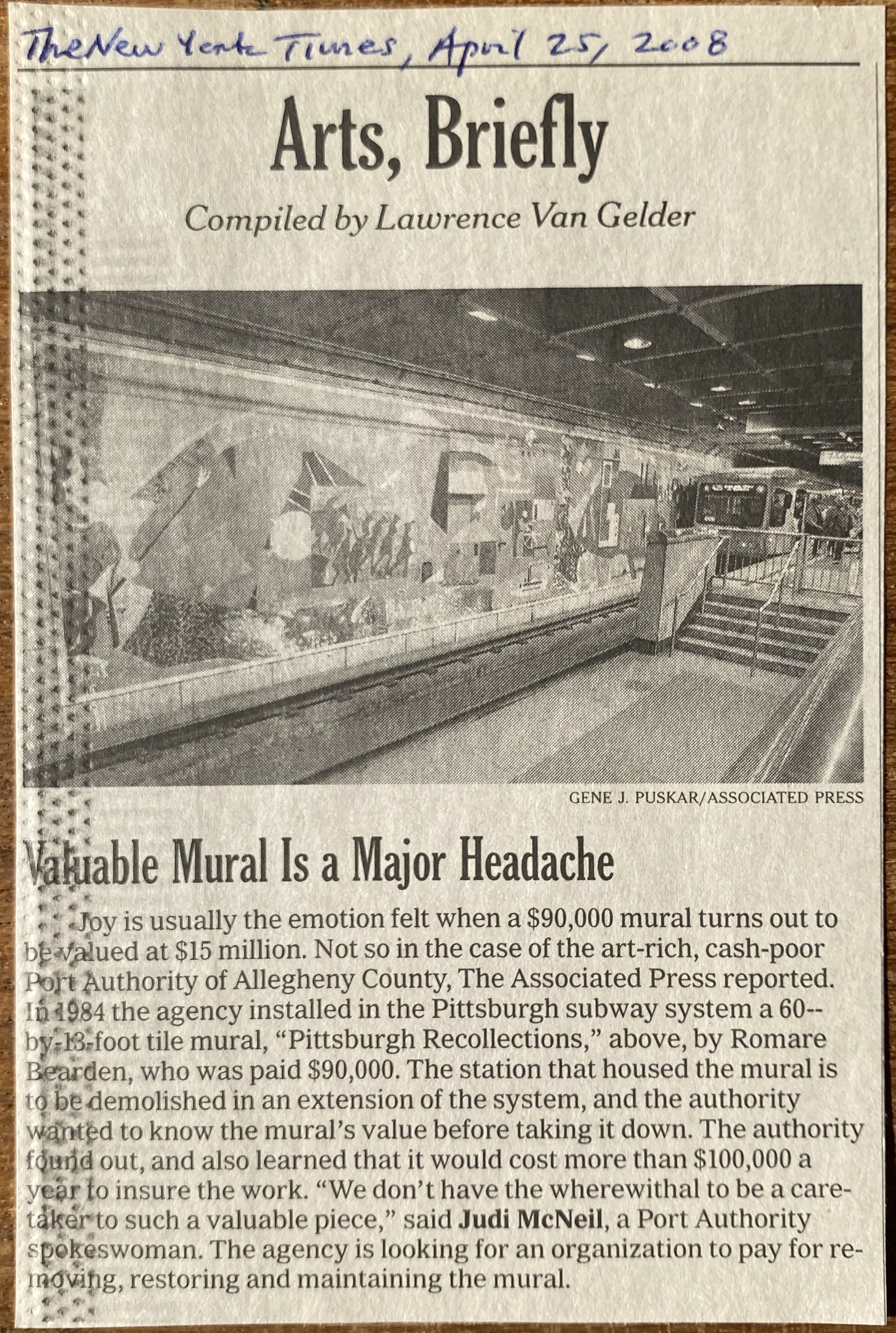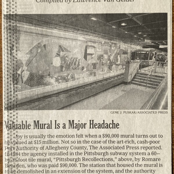 (Romare Bearden). Lawrence Van Gelder. Valuable Mural Is a Major Headache. The New York Times. April 25, 2008. Clipping