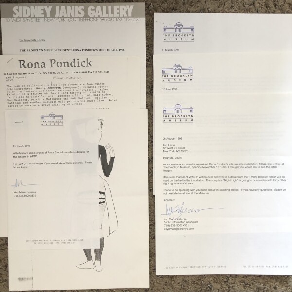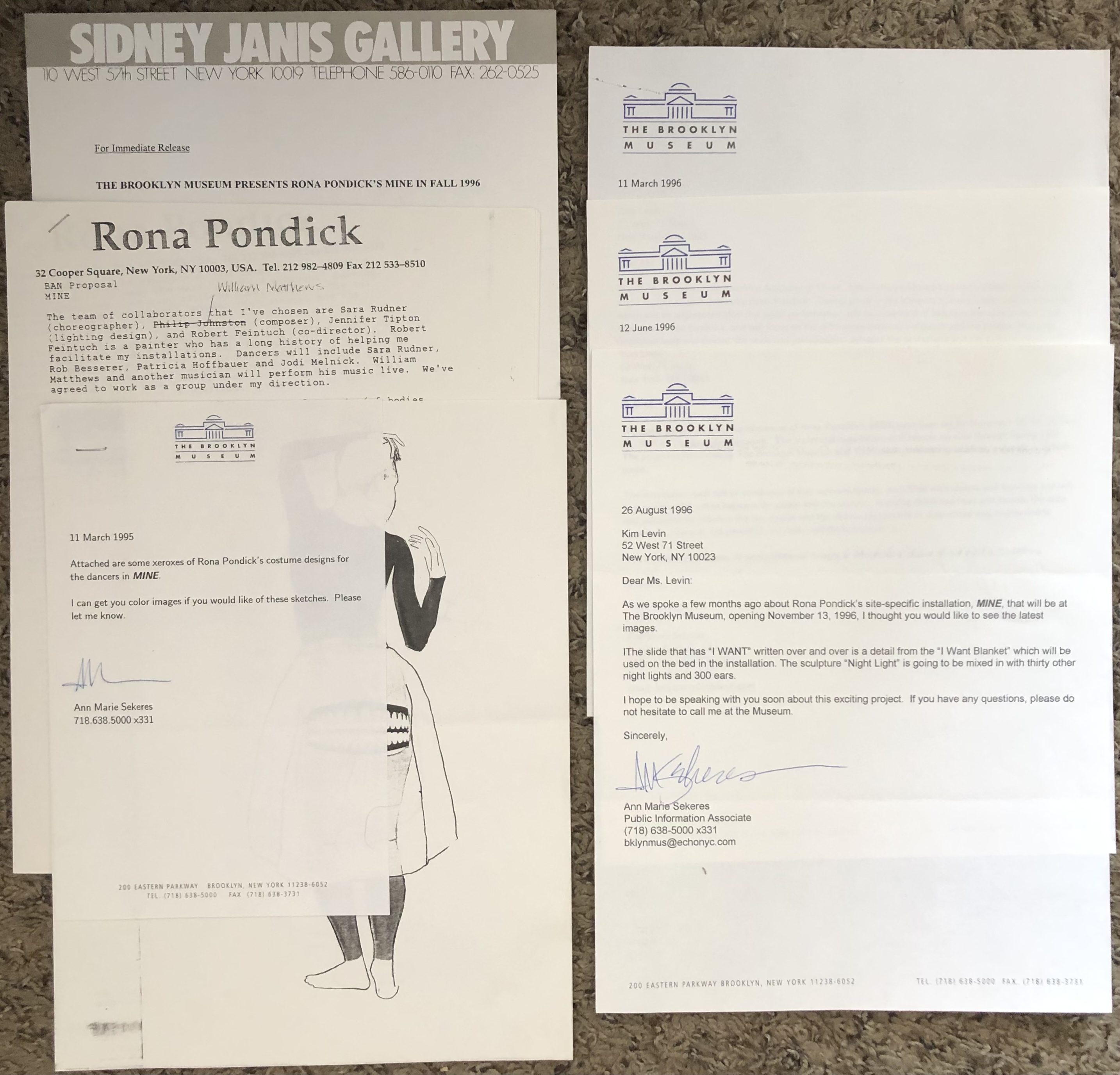 1-page Sidney Janis Gallery, New York, press release - Rona Pondick. BAN (sic, i.e. BAM) Proposal / MINE. No date [1996]. [3 photocopy pages] (“The team of collaborators that I’ve chosen…”)