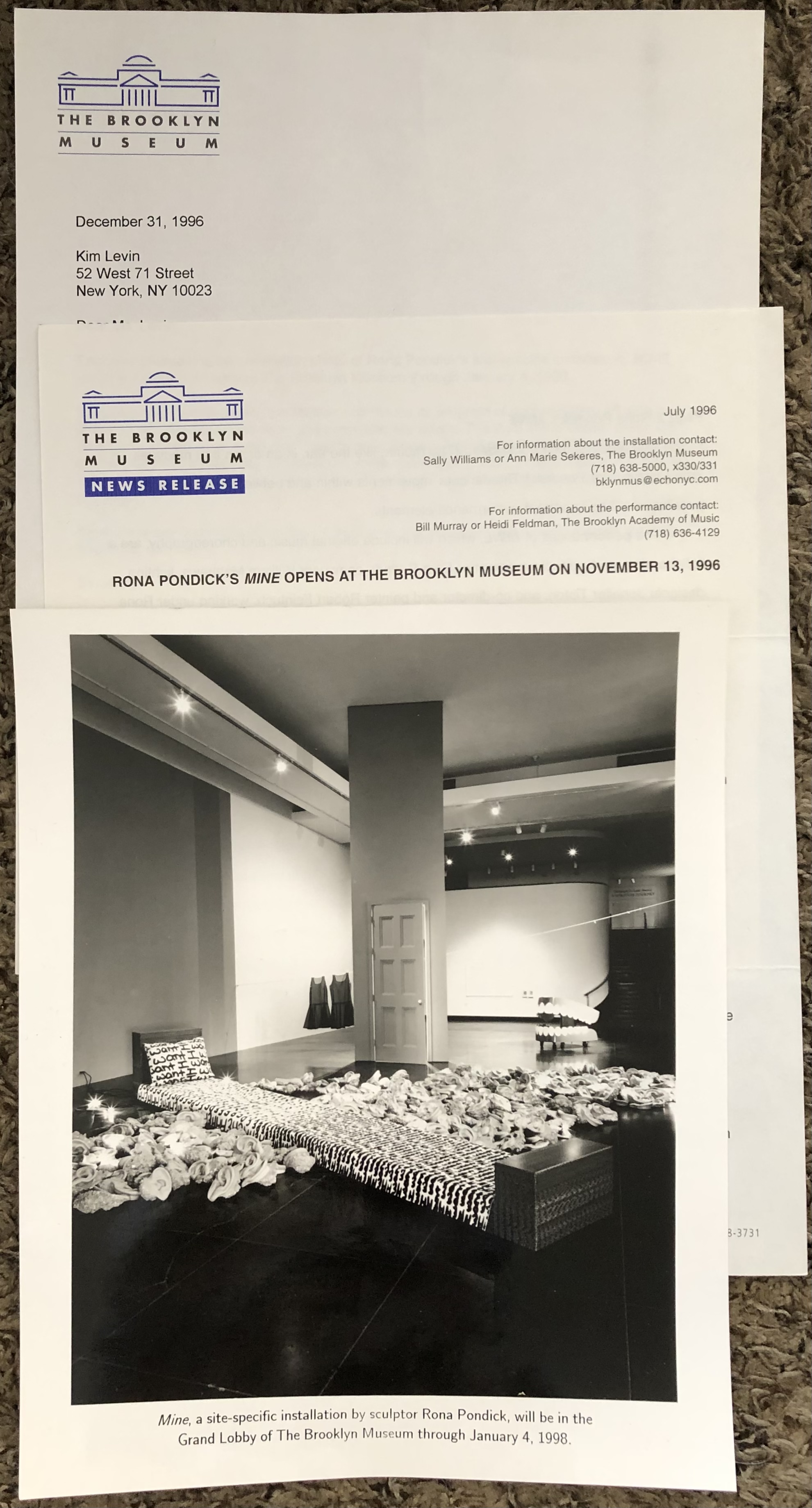 - Rona Pondick’s MINE open at The Brooklyn Museum on November 13, 1996. 2-page (1 sheet) press release