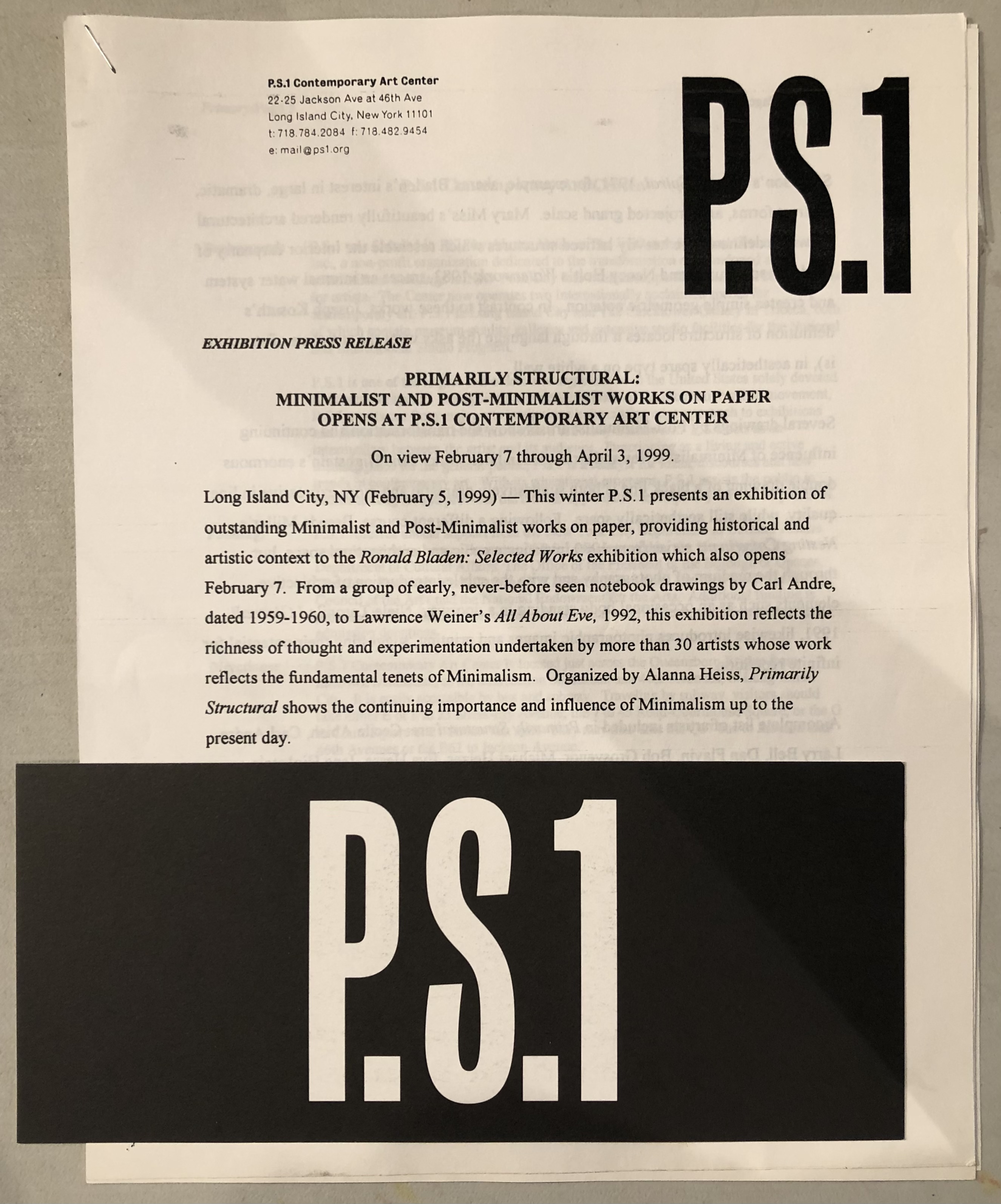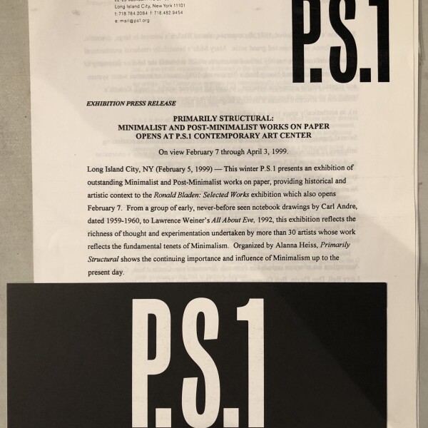 (Ronald Bladen). Ronald Bladen, Selected Works. P.S.1, Long Island City, New York, February 7 – April 3, 1999
