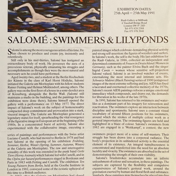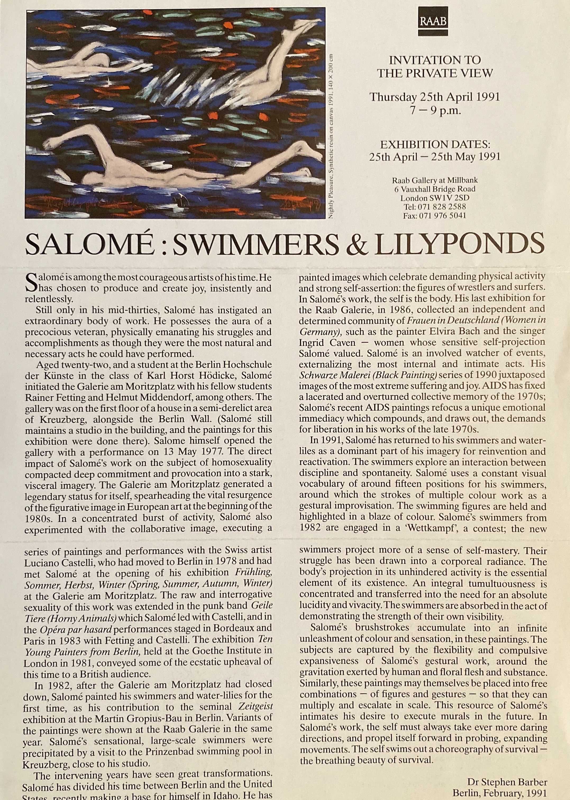 (Salomé, Wolfgang Cilarz known as). Salomé: Swimmers & Lilyponds. Raab Galerie at Millbank, London 25 April 1991