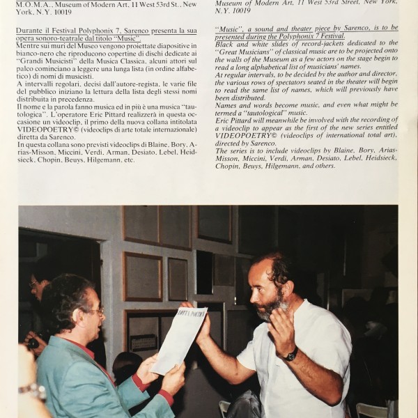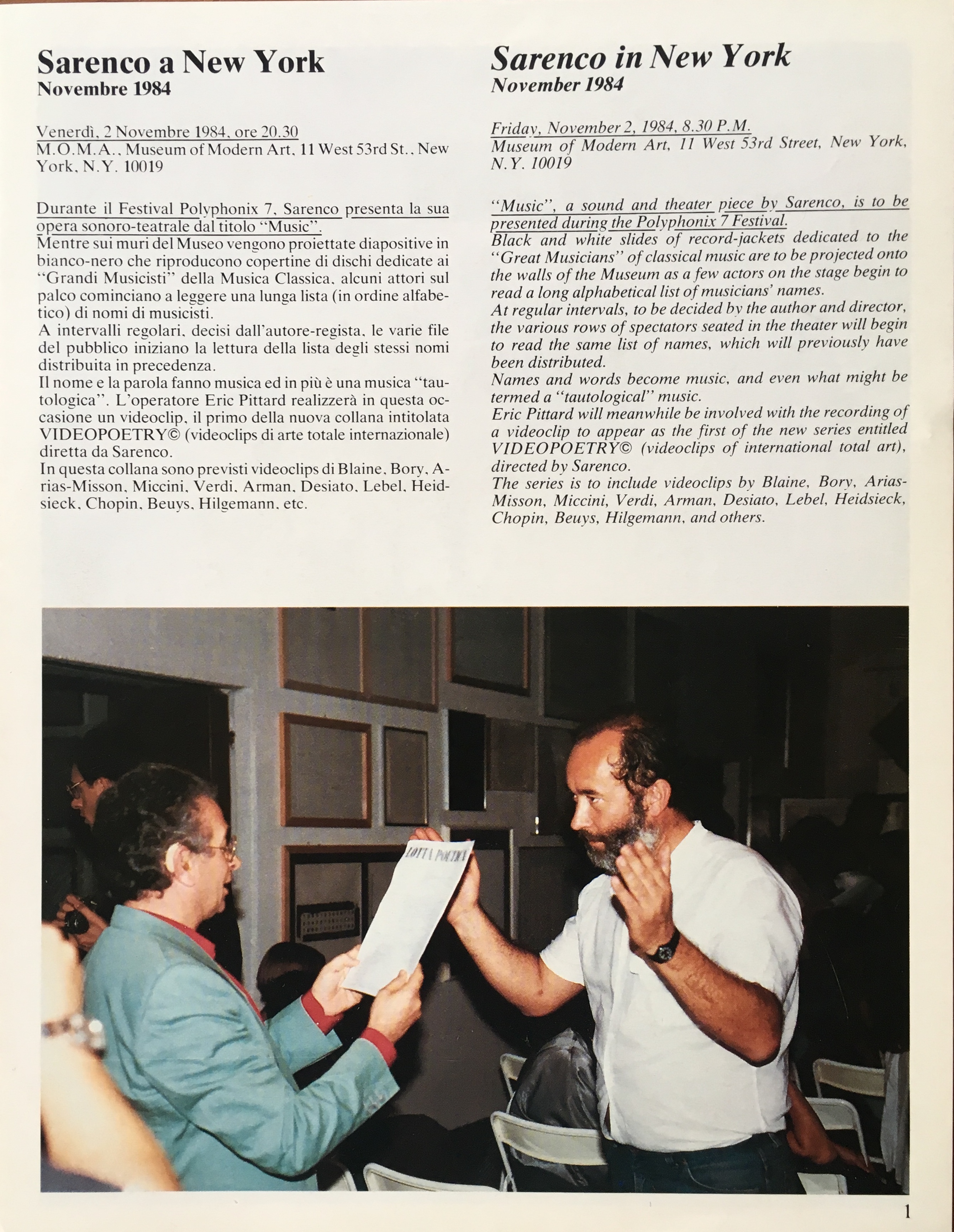 (Sarenco). (Isaia Mabellini known as). Sarenco a New York, Novembre 1984 / Sarenco in New York, November 1984