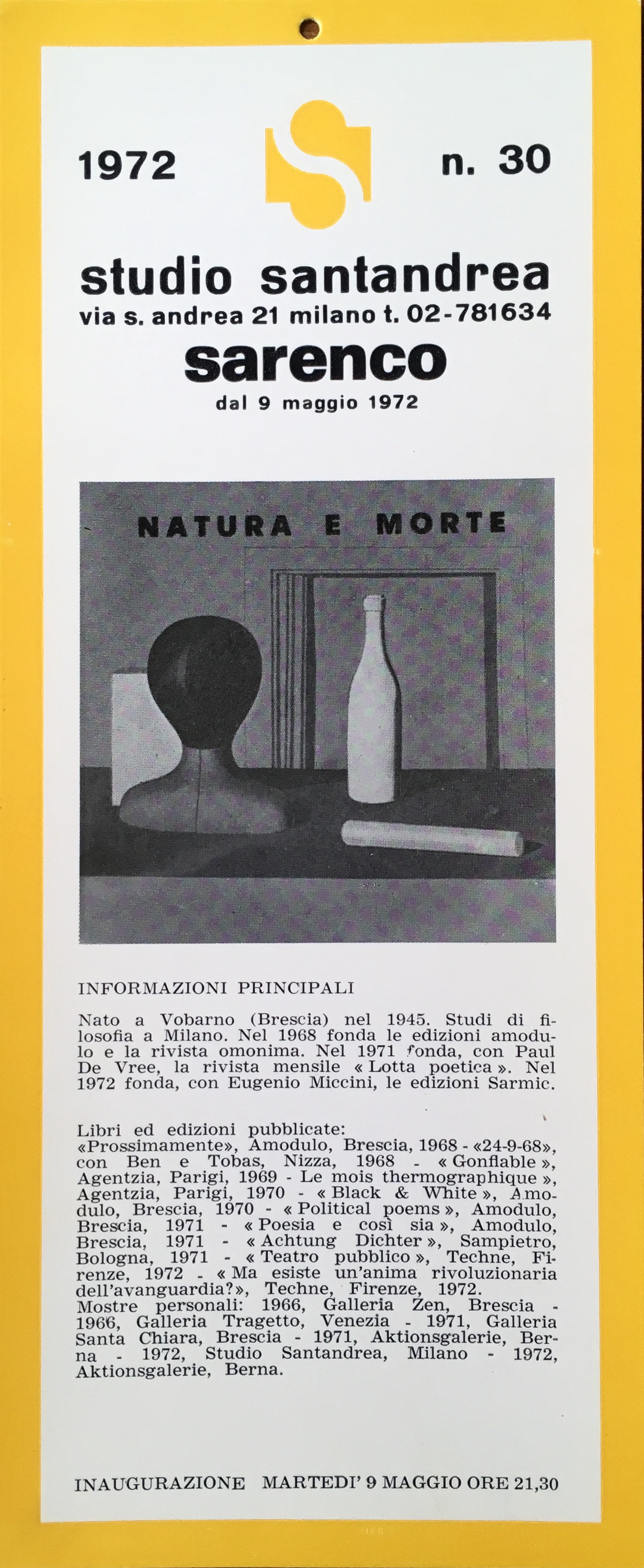 Sarenco (Isaia Mabellini known as). Sarenco. Studio Santandrea, Milano. Dal 9 maggio 1972. (N. 30)