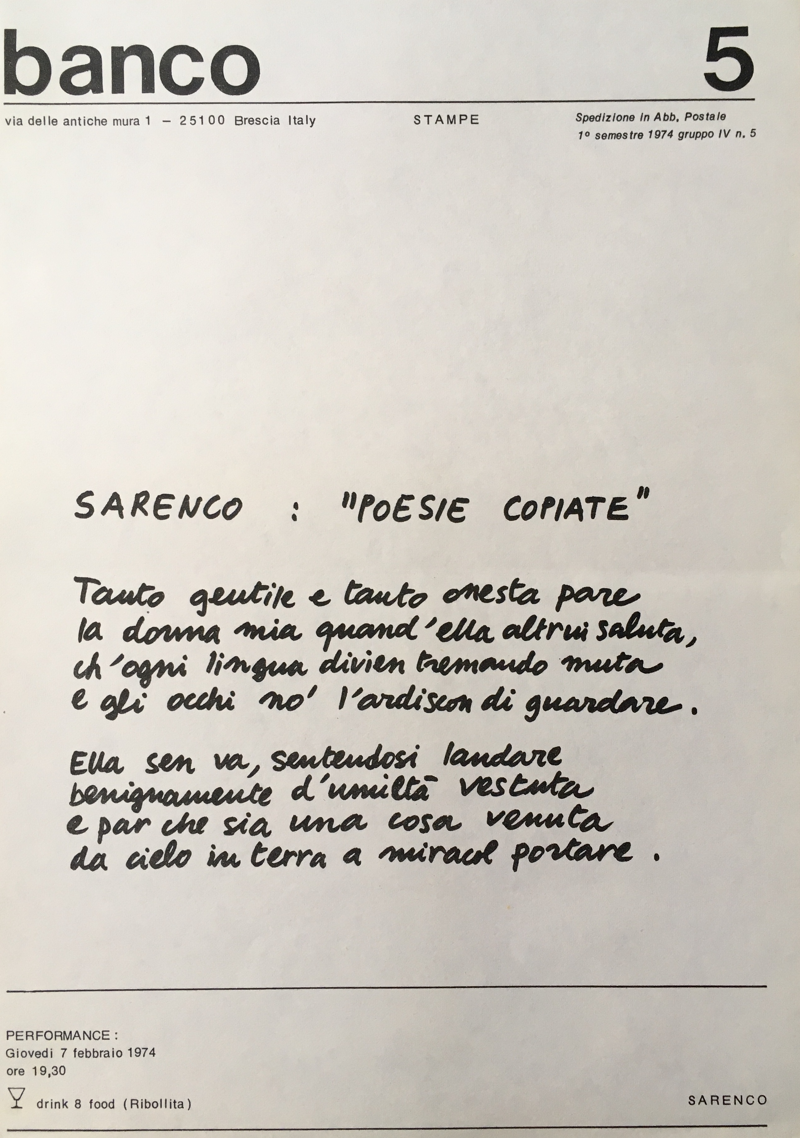 (Sarenco). (Isaia Mabellini known as). Sarenco: “Poesie Copiate” / Banco, Brescia, Performance: 7 febbraio 1974, Banco, Brescia. (Banco 5)