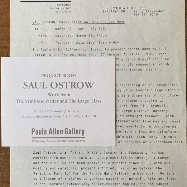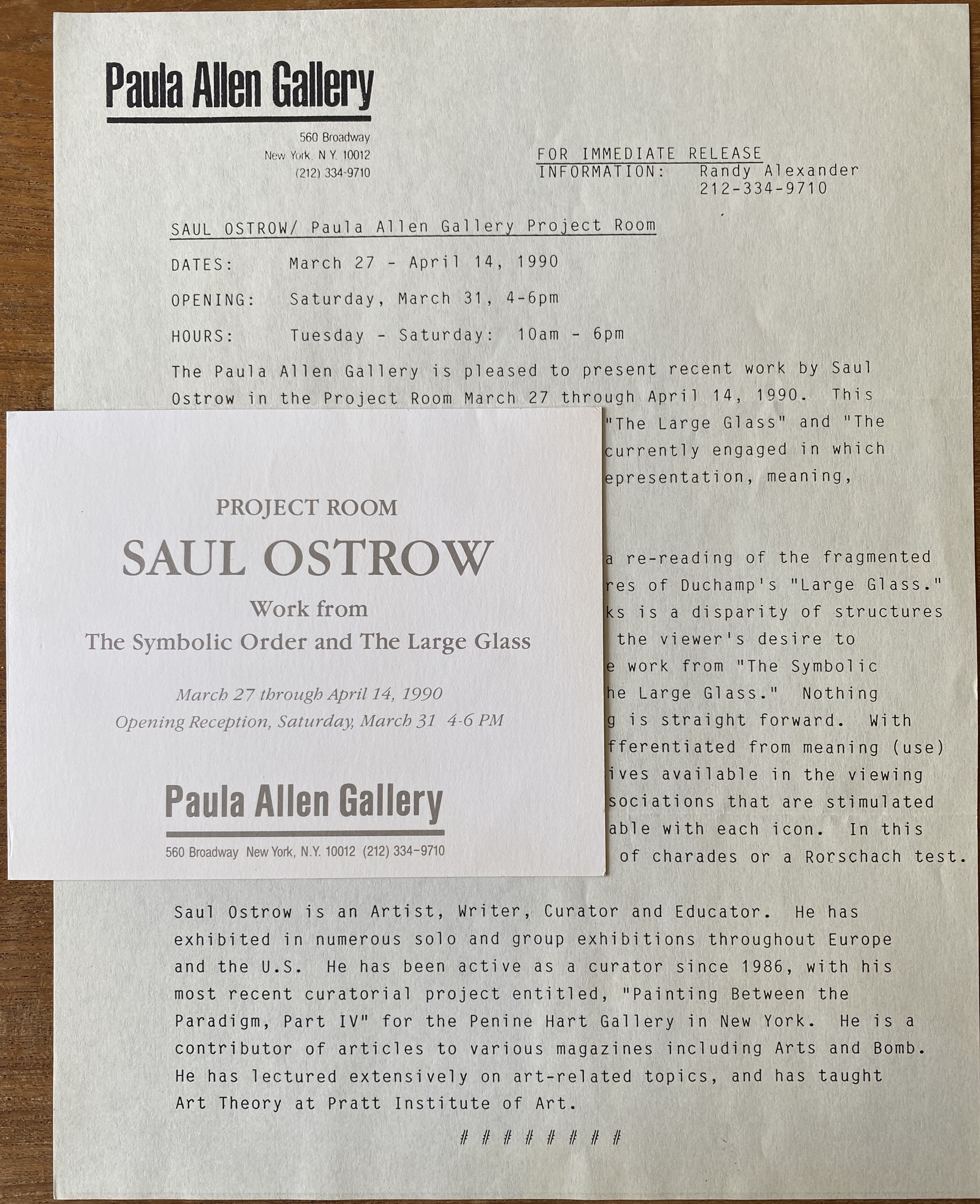 Saul Ostrow. Work from The Symbolic Order and The Large Glass. Paula Allen Gallery, New York, March 27 – April 14, 1990