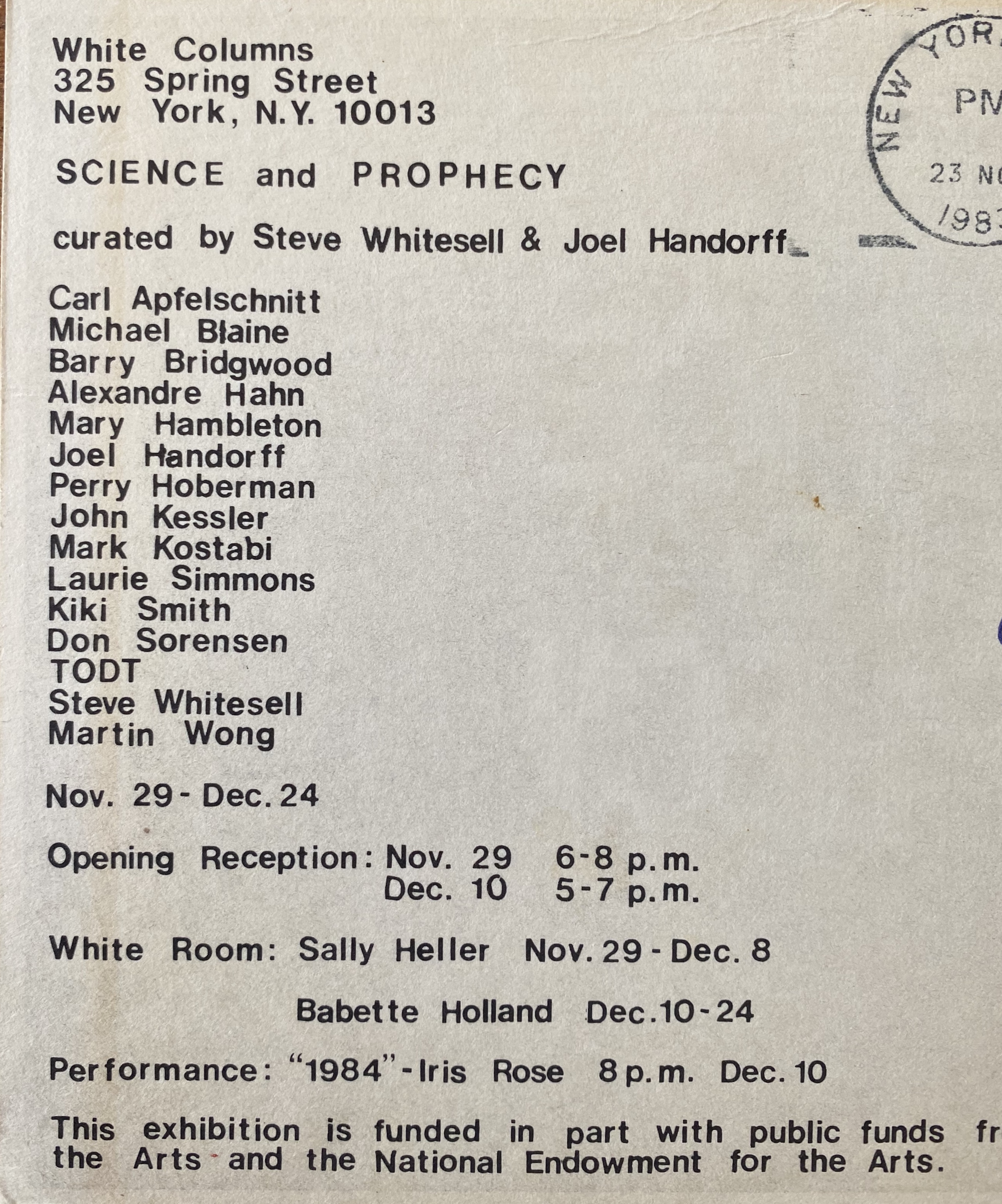 Science and Prophecy. White Columns, New York, November 29 – December 24, [1983]