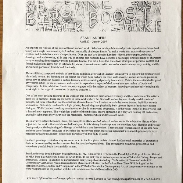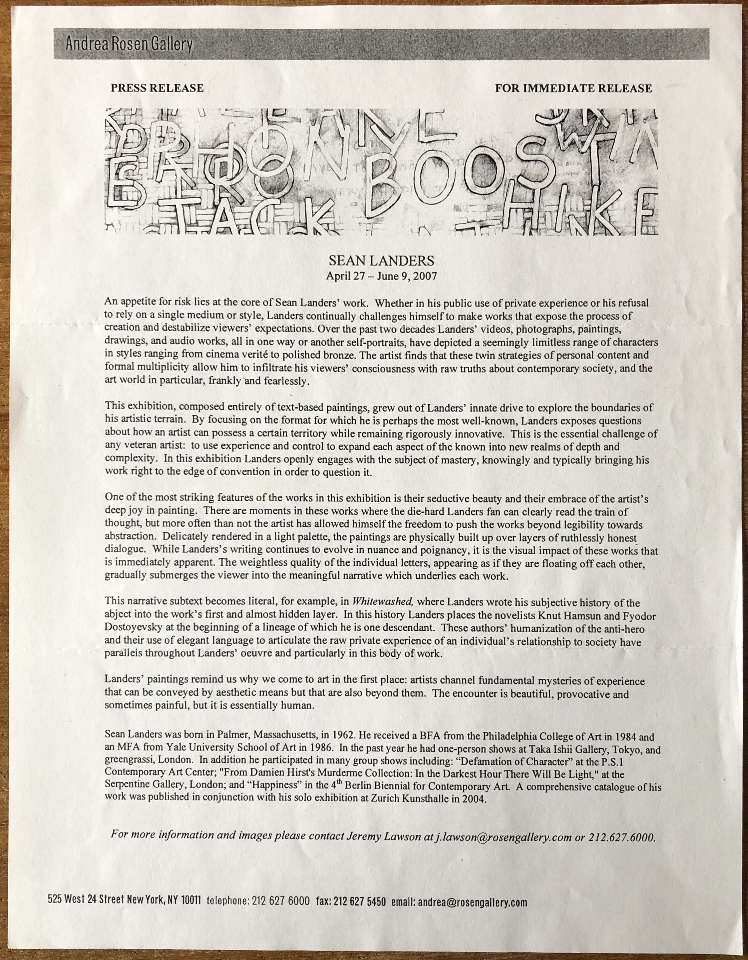 (Sean Landers). Sean Landers. Andrea Rosen Gallery, New York, April 17 – June 9, 2007