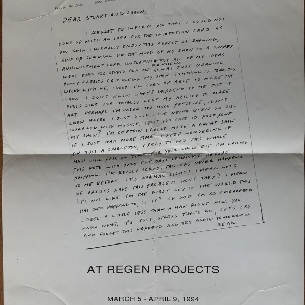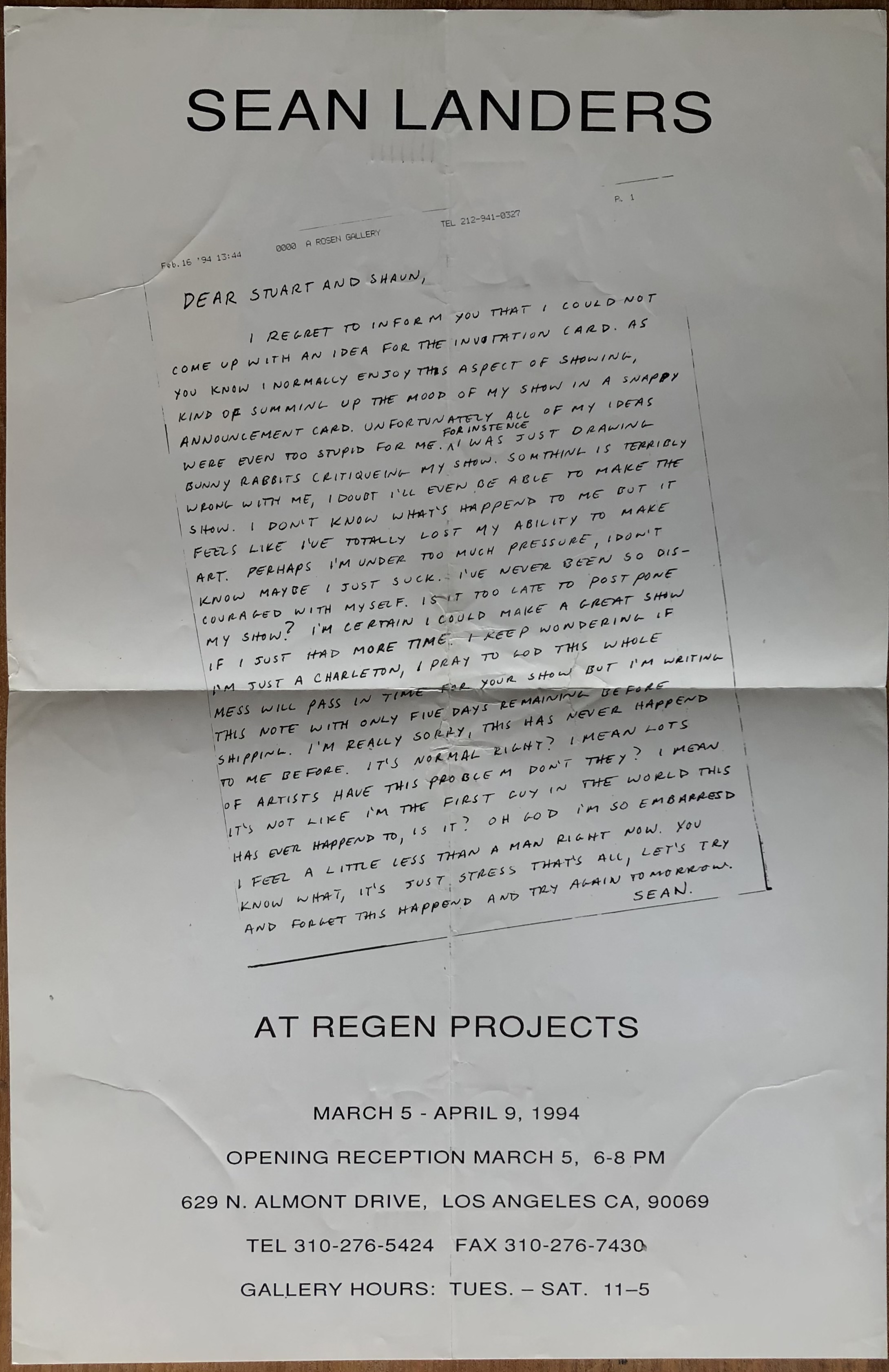 (Sean Landers). Sean Landers at Regen Projects. March 5 – April 9, 1994