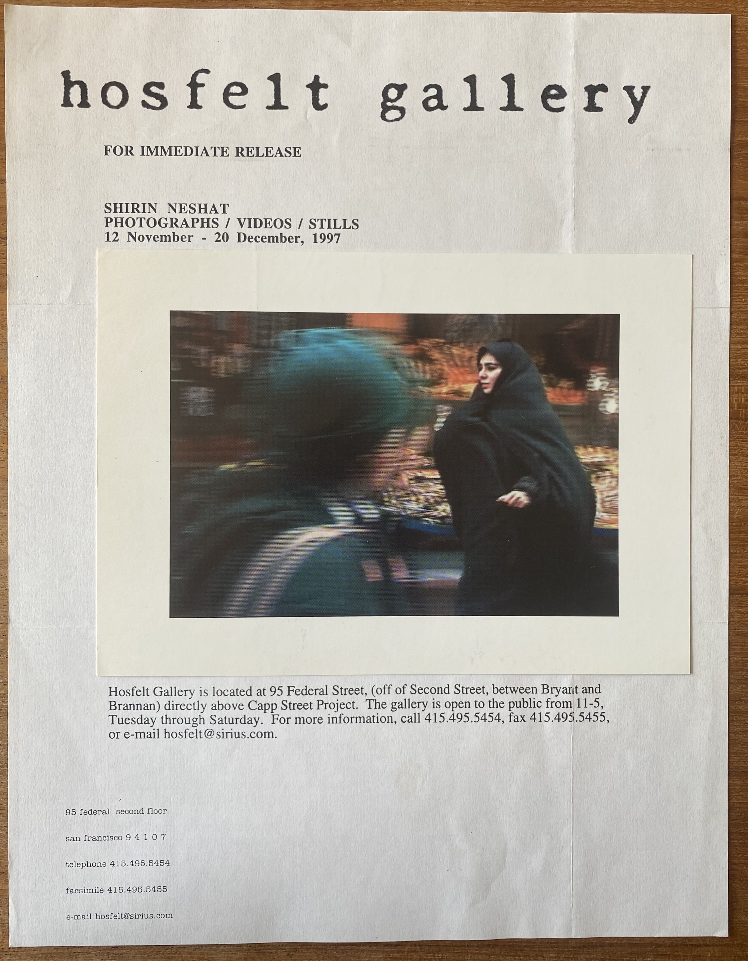 Shirin Neshat. Photographs/Videos/Stills. Hosfelt Gallery, San Francisco, California, 15 November – 20 December, [1997].