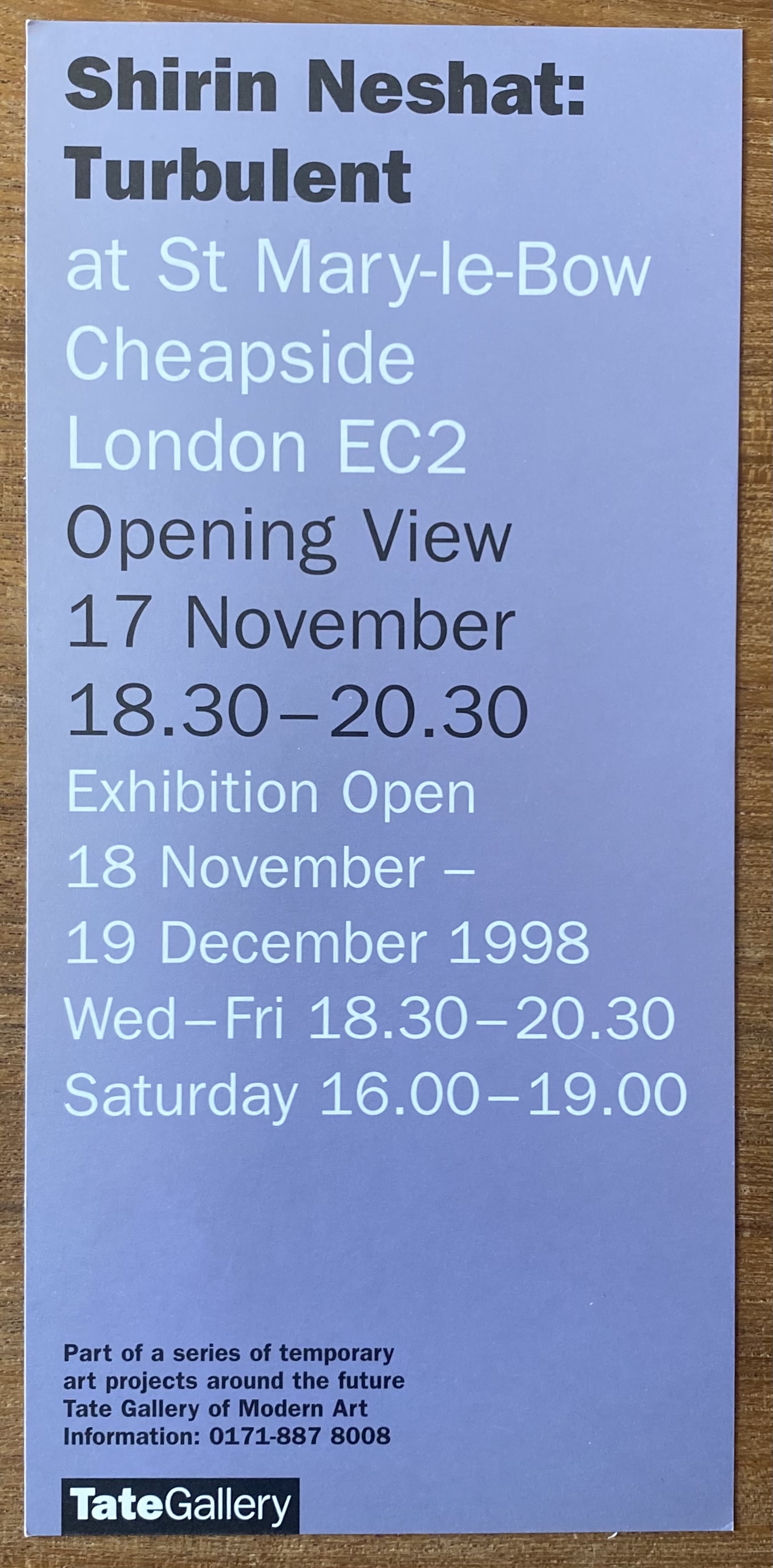 (Shirin Neshat). Shirin Neshat: Turbulent. St. Mary-le-Bow, Cheapsie, London, 17, 18 November – 19 December 1998.