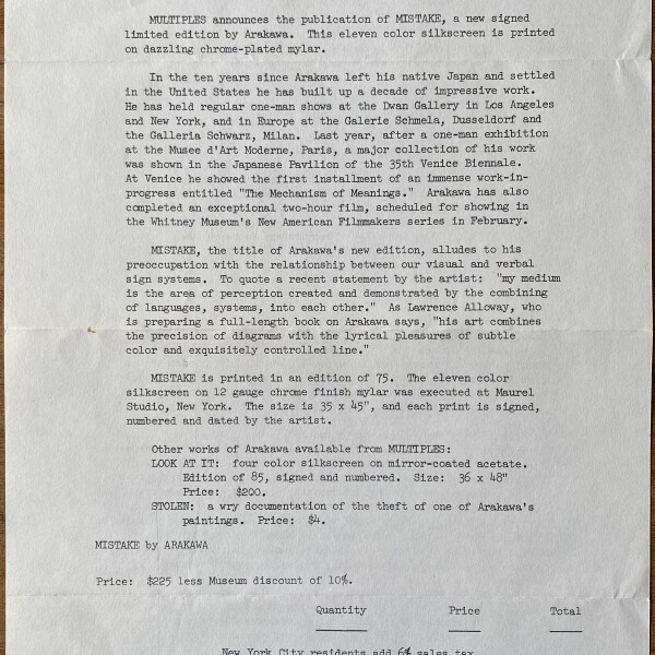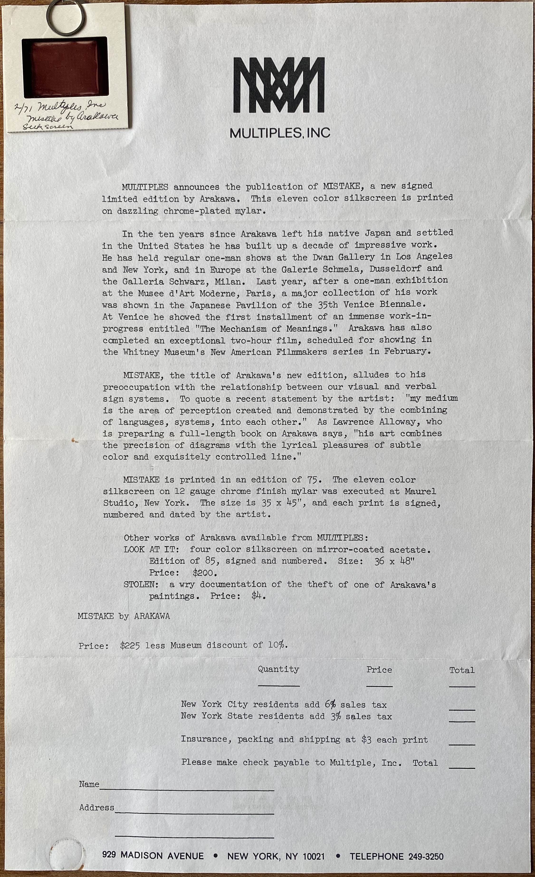 (Shusaku Arakawa). Arakawa. Mistake. Multiples Inc., New York, 1970