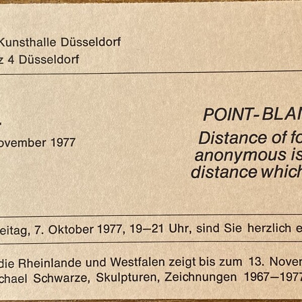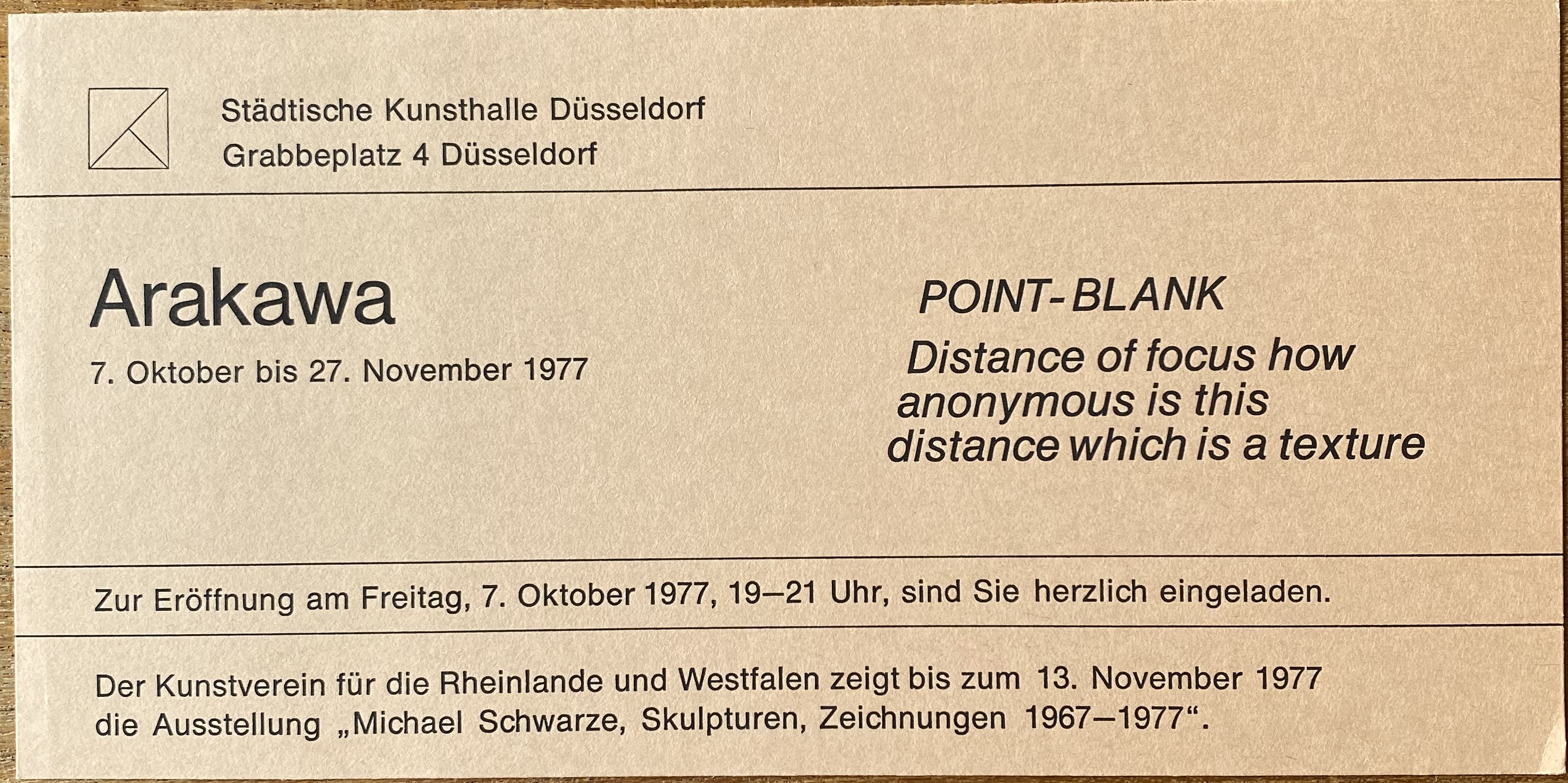 (Shusaku Arakawa). Arakawa. Point-Blank: Distance which is a texture. Städtische Kunshalle Düsseldorf, Düsseldorf, 7. Oktober – 27. November 1977
