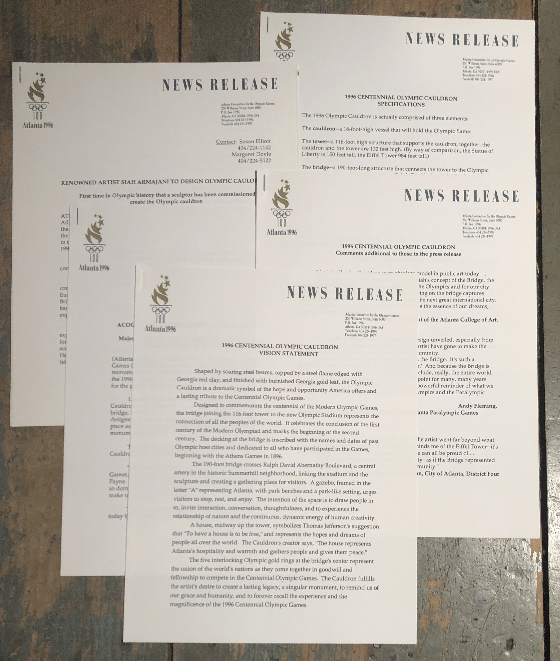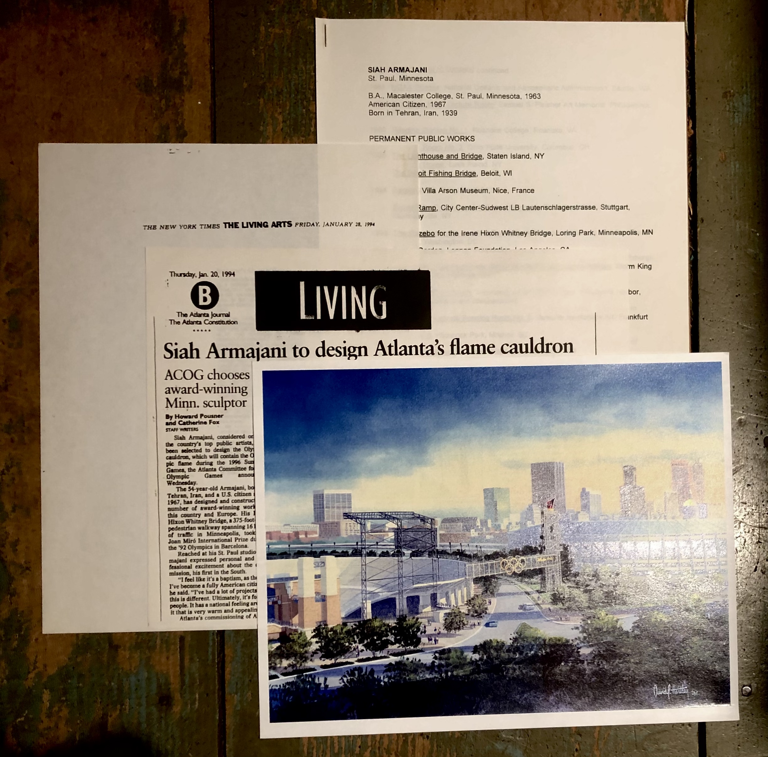 - Howard Ponsner and Catherine Fox. Siah Armajani to design Atlanta’s flame cauldron. The Atlanta Journal The Atlanta Constitution. January 20, 1994. 1 page. (Photocopy)