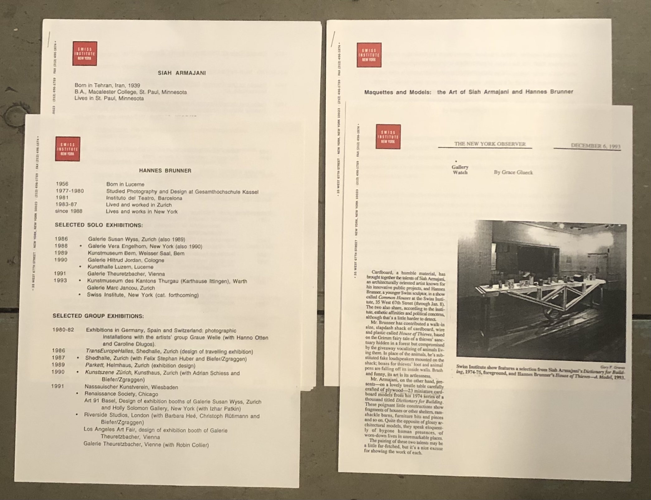 - Grace Glueck. Gallery Watch. The New York Observer. December 6, 1993 (photocopy)
