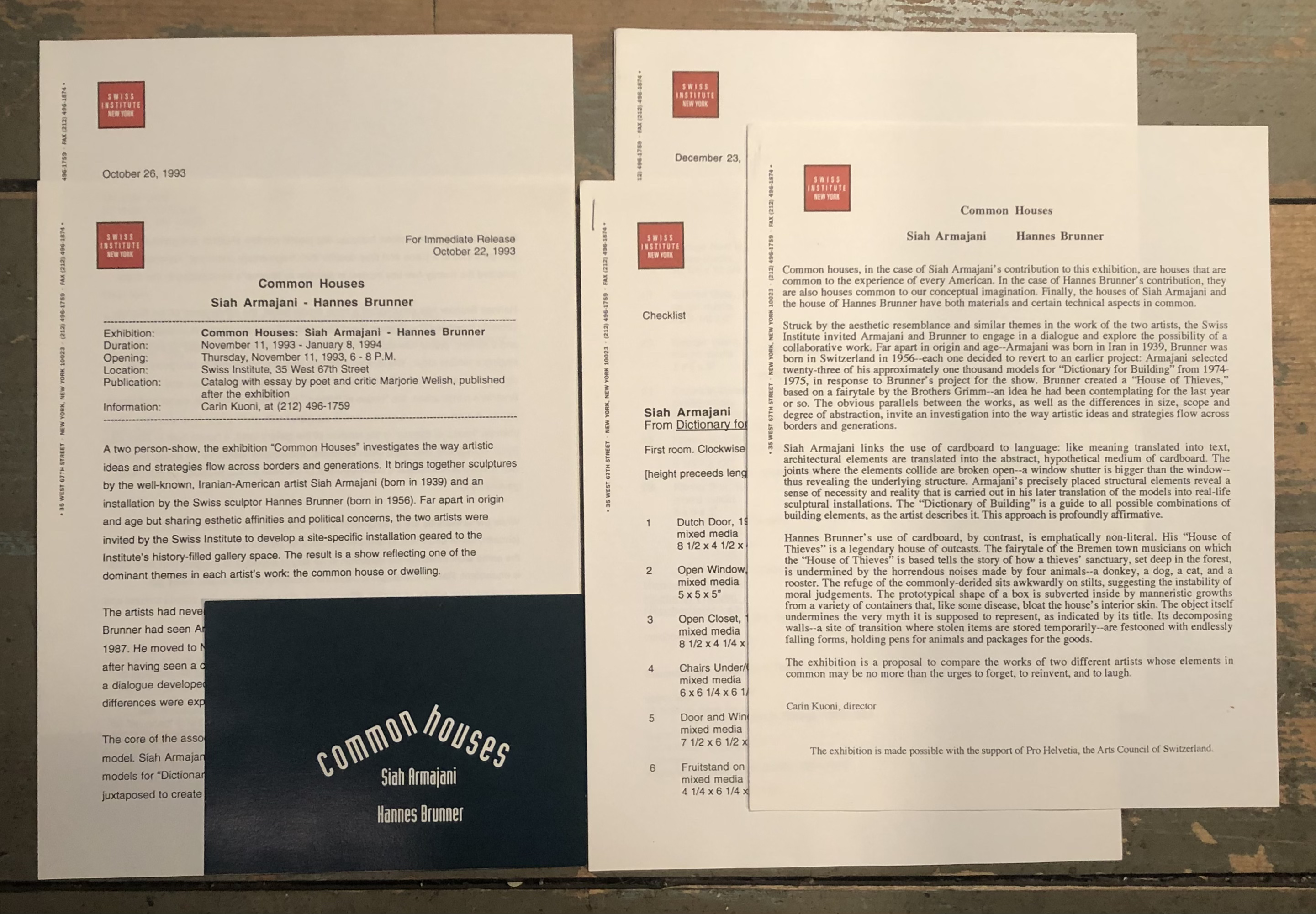 (Siah Armajani). Common Houses: Siah Armajani / Hannes Brunner. The Swiss Institute New York, New York, Novemeber 11, 1993 – January 8, 1994. 14 physical items.