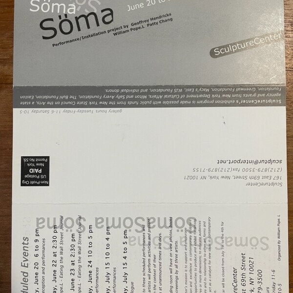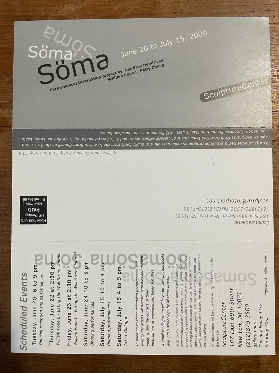 Söma, Söma, Söma. Performance / Installation project by Geoffrey Hendricks, William Pope.L, Patty Chang. Sculpture Center, New York, June 20 – July 15, 2000