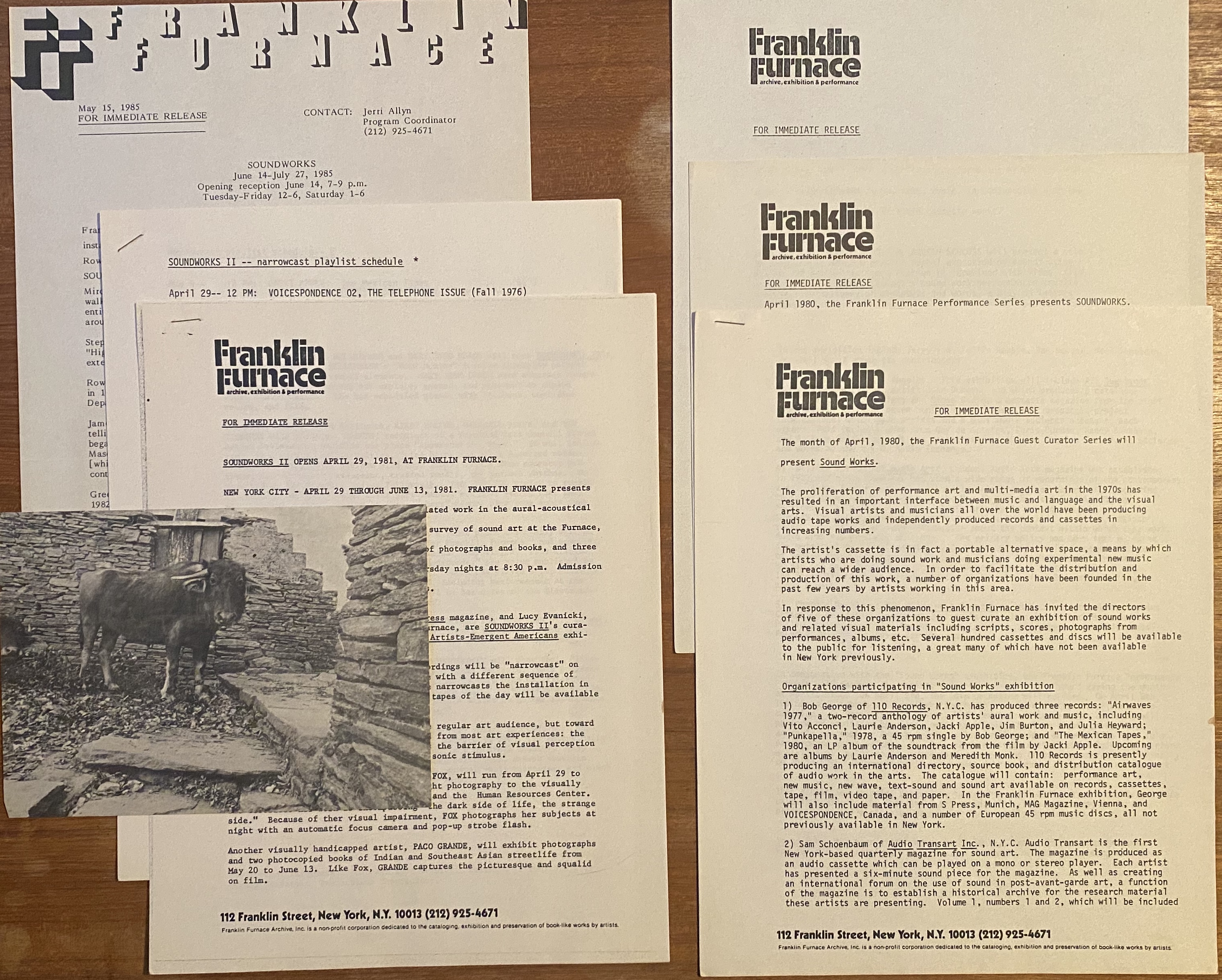 Soundworks II opens April 29, 1981 at Franklin Furnace. Press release. 2 pages (=sheets). (vintage photocopy).