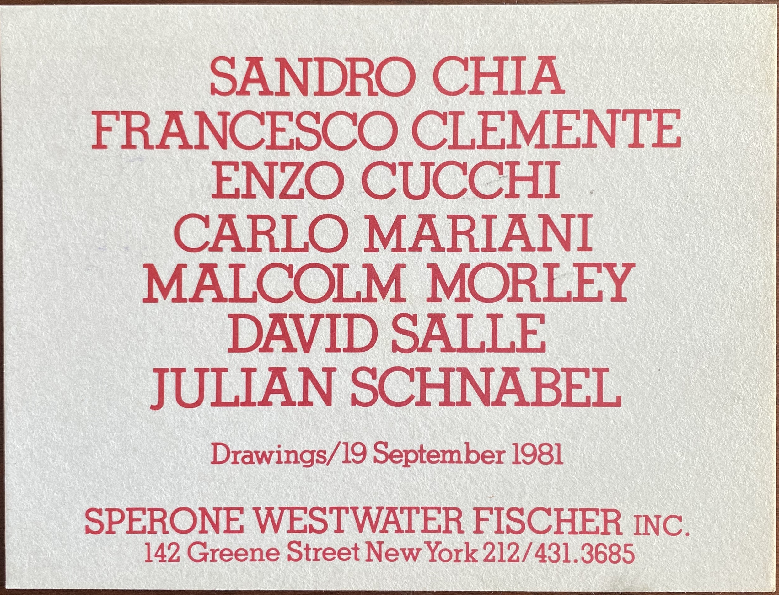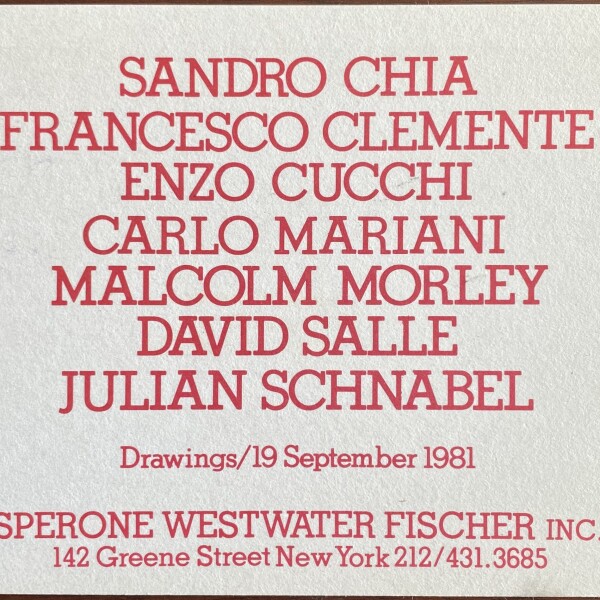 Sperone Westwater Fischer Inc., New York, 19 September 1981. Drawings: Sandro Chia, Francesco Clemente, Enzo Cucchi, Carlo Mariani, Malcom Morley, David Salle, Julian Schnabel