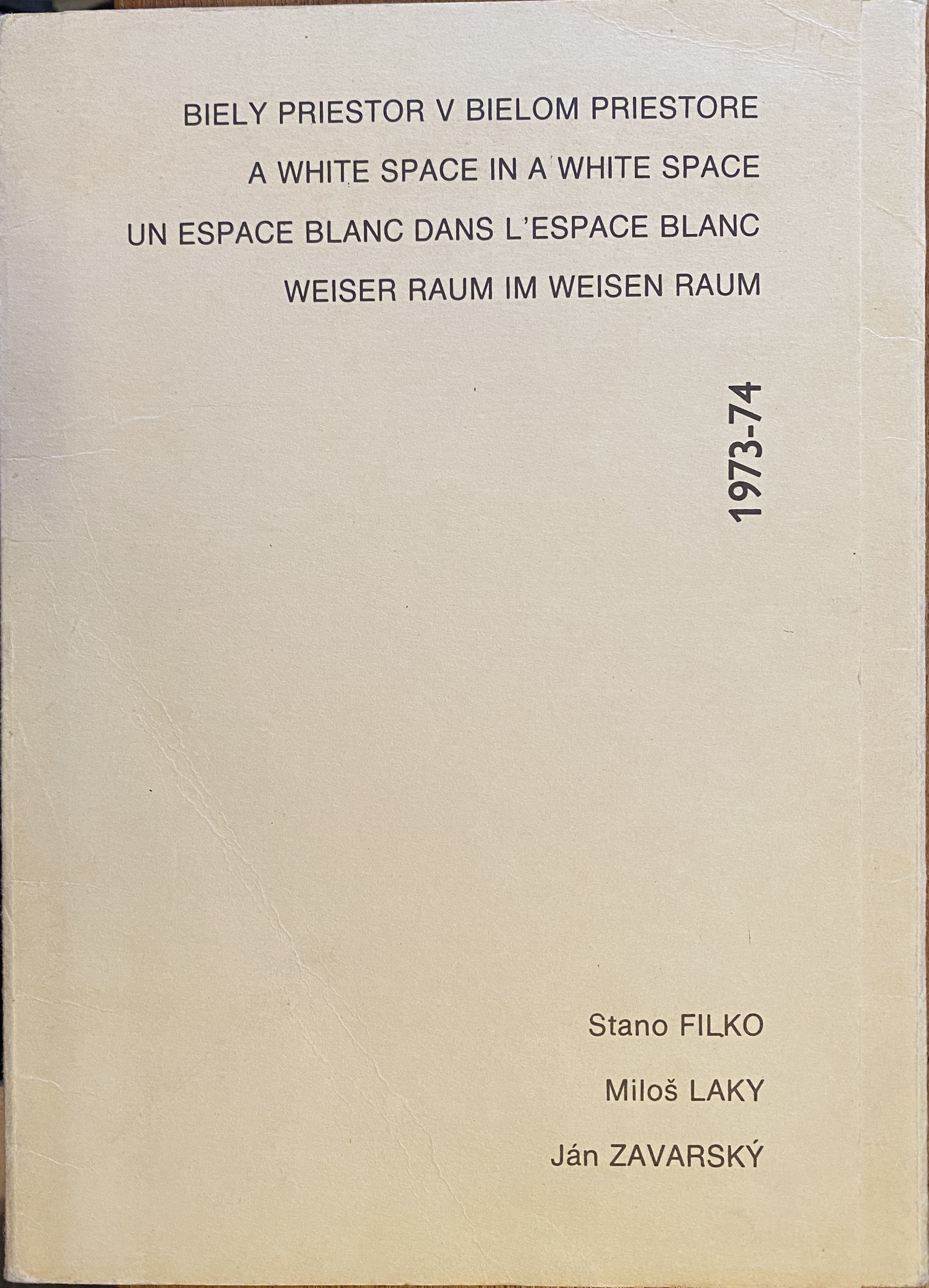 (Stanislav Filko, Miloš Laky, Ján Zavarsky). Stano Filko, Miloš Laky, Ján Zavarsky. Biely priester v bielom priestore / A white space in a white space / Un espace blanc dans l’espace blanc / Weiser (si., i.e. Weisser) Raum im weisen (sic. i.e. weissen) Raum. 1973-74. (Cover title). [Bratislava, 1974]