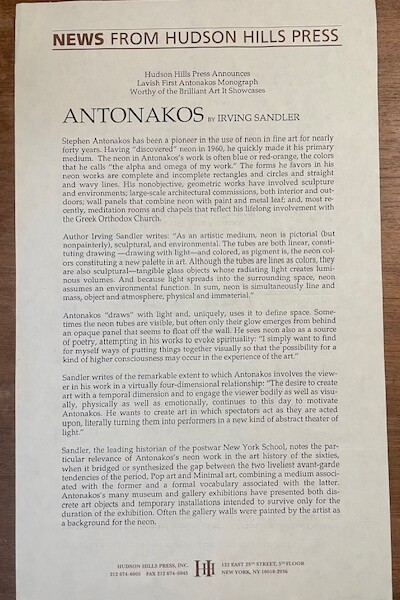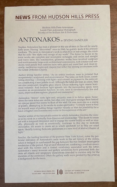 (Stephen Antonakos). Antonakos by Irving Sandler. New York: Hudson Hill Press, 1999