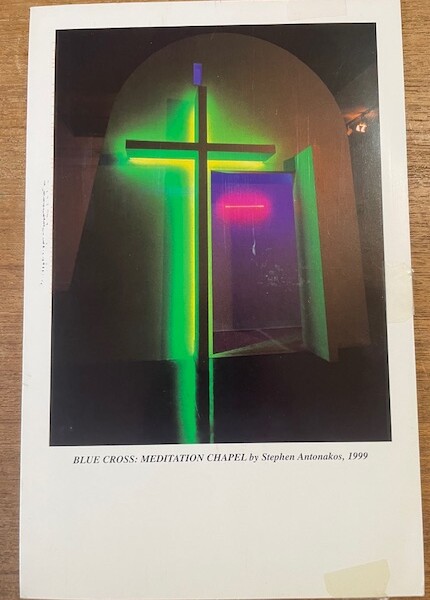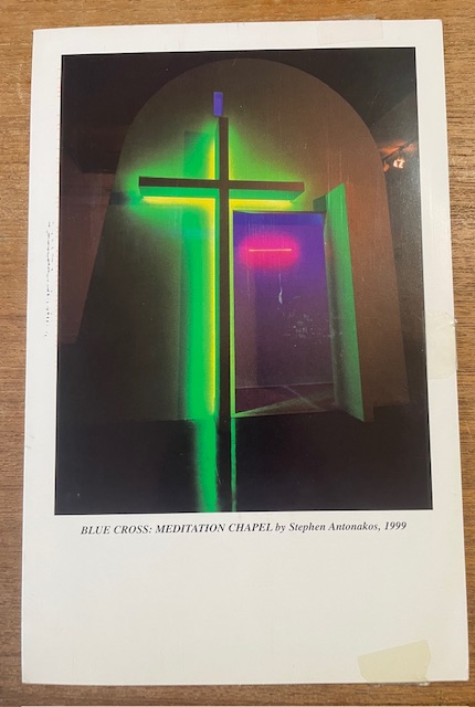 “Blue Cross-Meditation Chapel, Stephen Antonakos” by curator Gayle Paul. 3 color illustrations