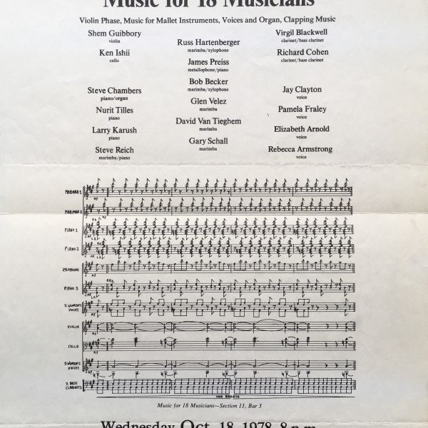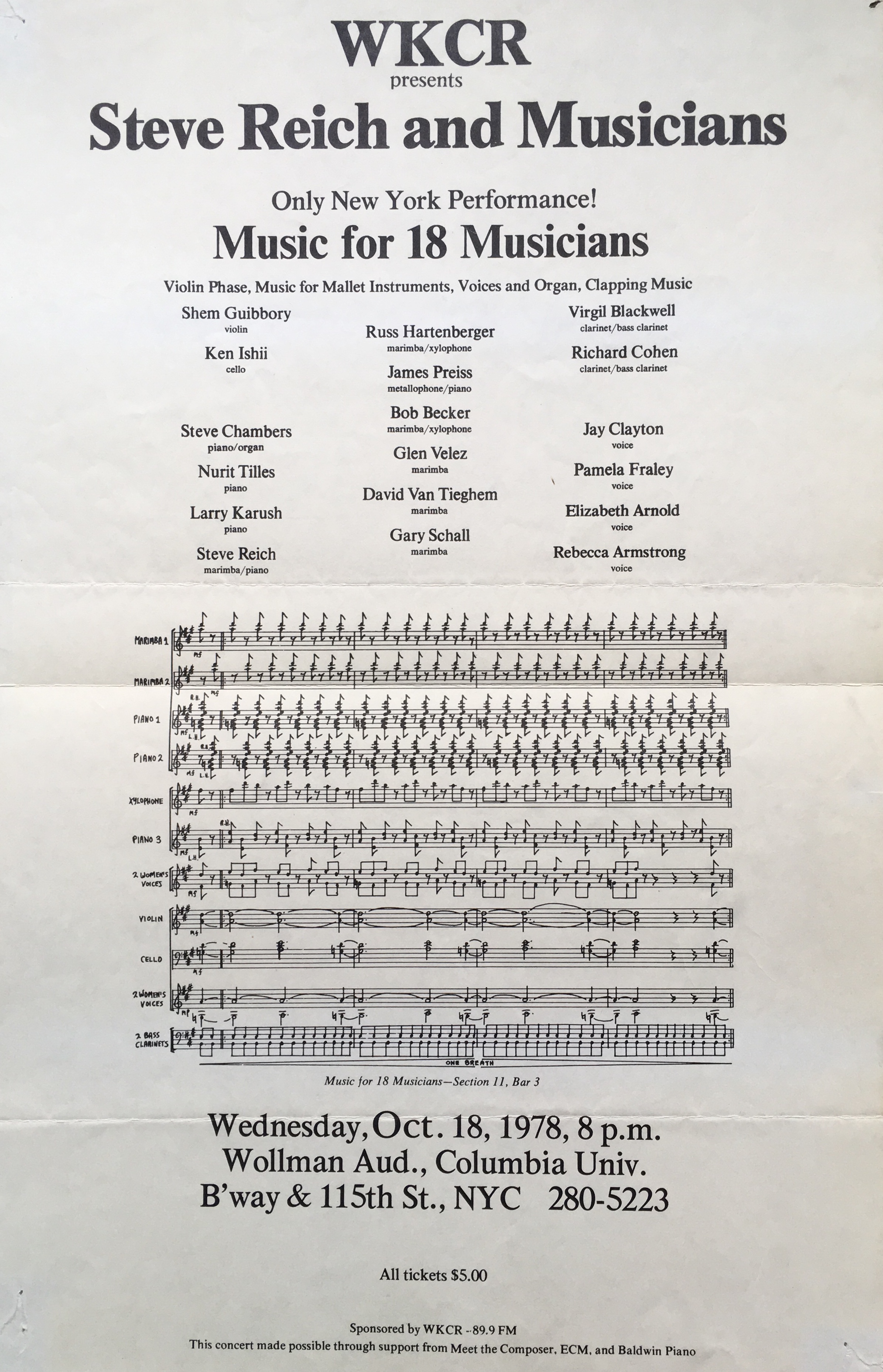 Steve Reich. Music for 18 Musicians. Wollman Auditorium, Columbia University, New York, October 18, 1978