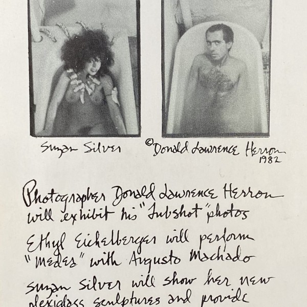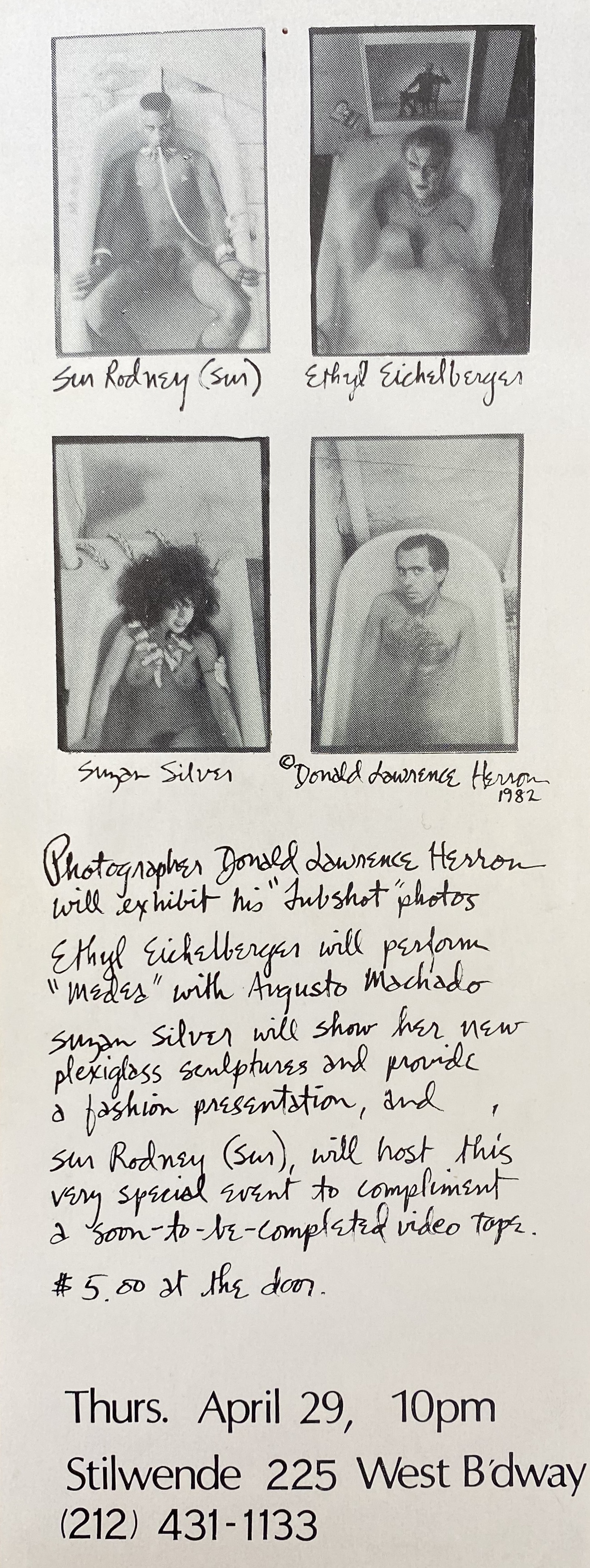 (Sur Rodney Sur, Ethyl Eichelberger, Suzan Silver, Donald Lawrence Herron). Donald Lawrence Herron. “Tubshot” Photos. Stilwende, New York, April 29, [1982]