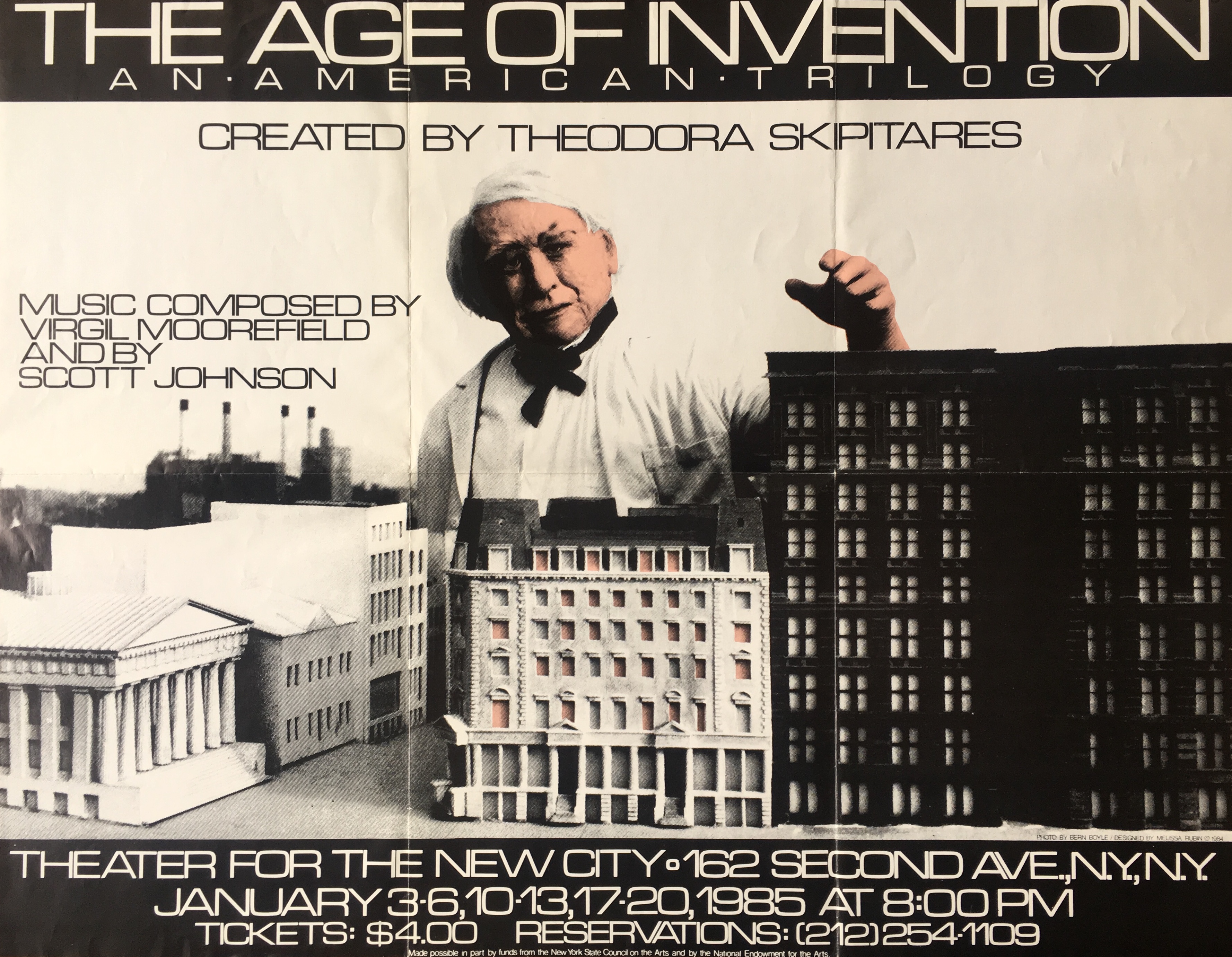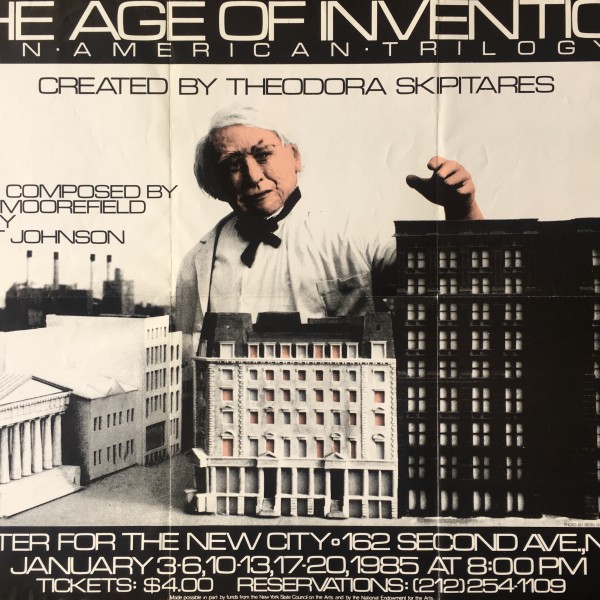 [Theodora Skipitares]. The Age of Invention; an American Trilogy. Created by Theodora Skipitares. Music composed by Virgil Moorefield and by Scott Johnson. Theatre for the New City, New York, January 3-6, 10-13, 17-20, 1985