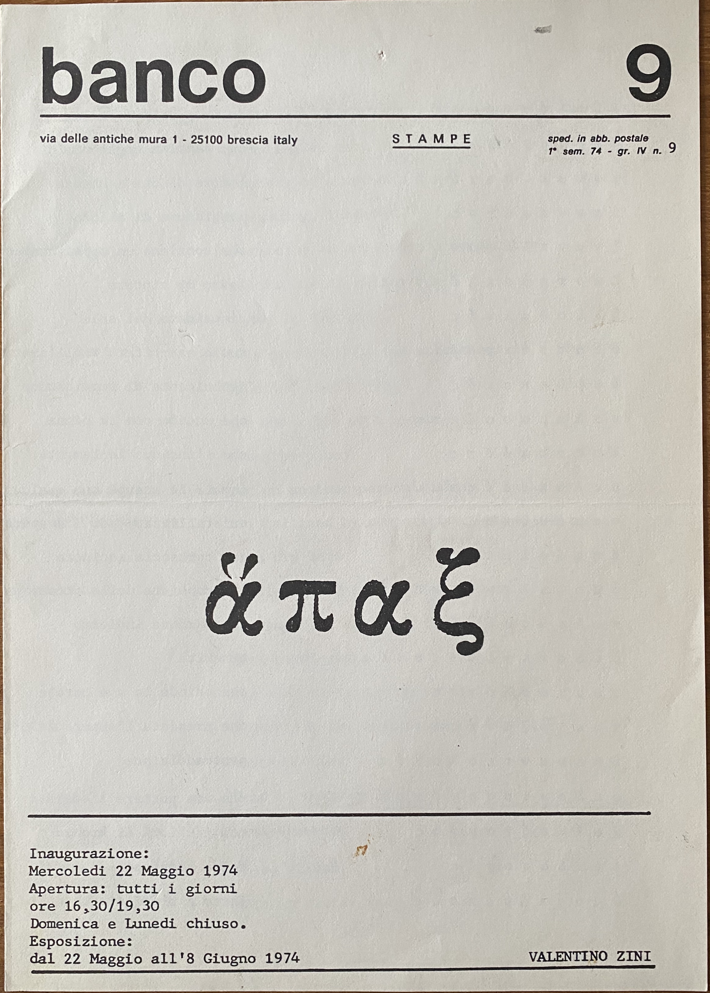 Valentino Zini. Apax. Banco, Brescia, 22 maggio – 8 giugno 1974. (9)