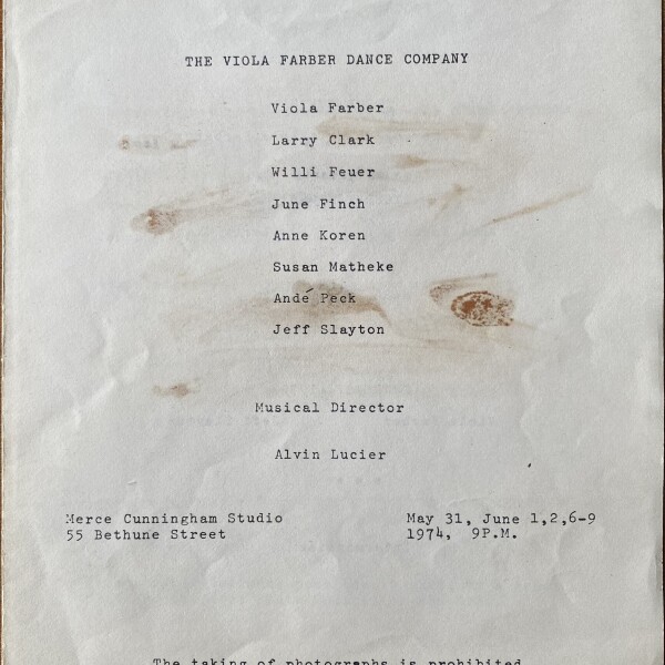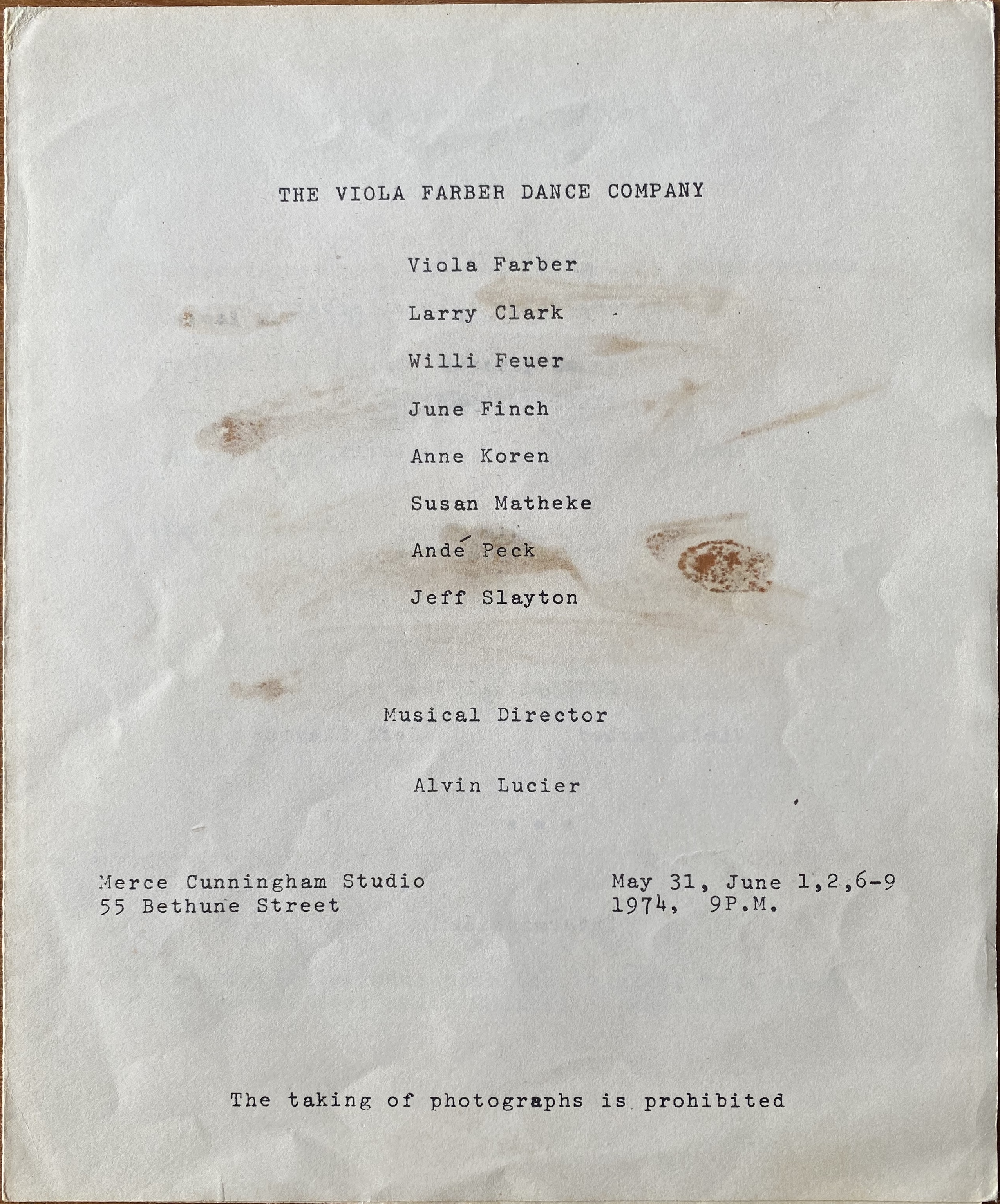 Program, June 7th and 9th. Willi I (1973). Choreography and costumes: Viola Farber. Music: Alvin Lucier / Dinosaur Parts (1974). Choreography: Viola Farber. Music David Tudor