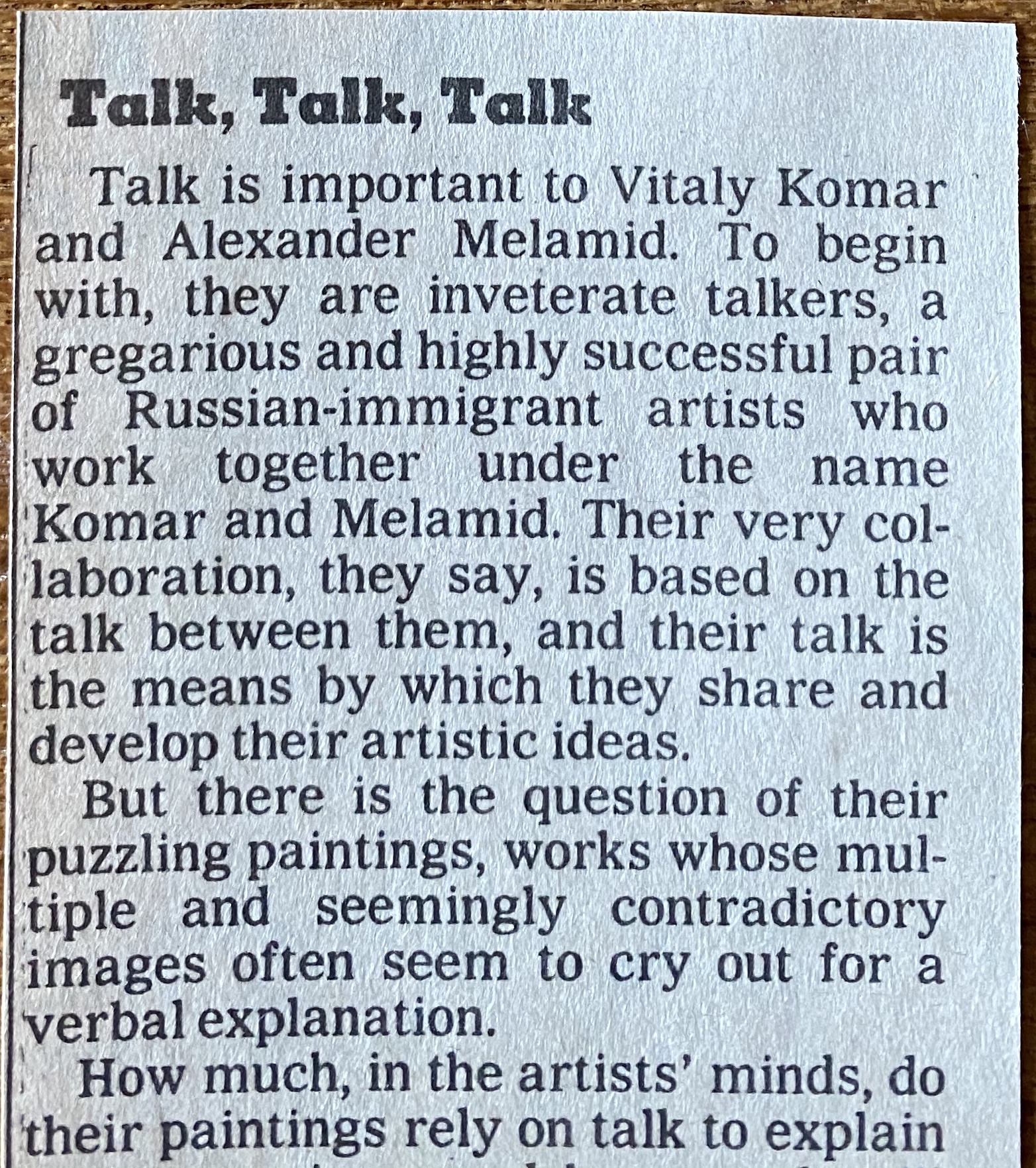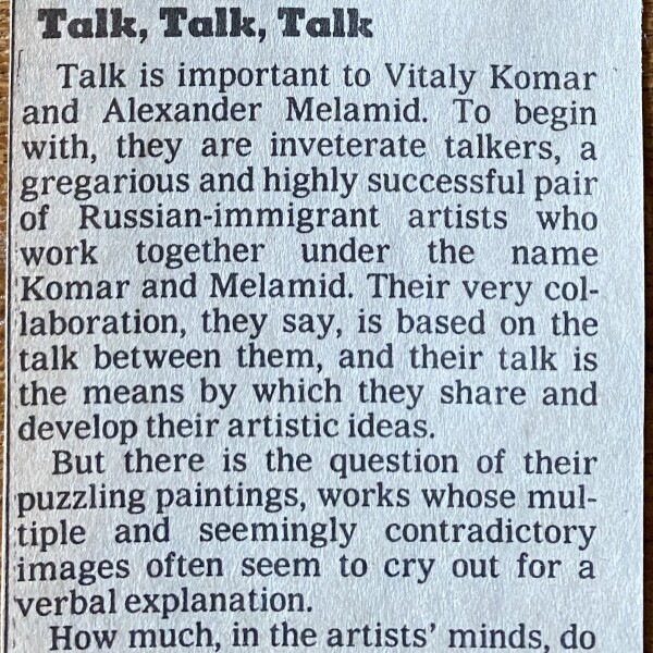 (Vitaly Komar and Alexander Melamid). Komar & Melamid. Douglas C. McGill. Talk, Talk, Talk. The New York Times, October 2, 1987. Clipping. 59 lines.