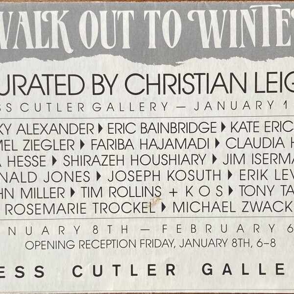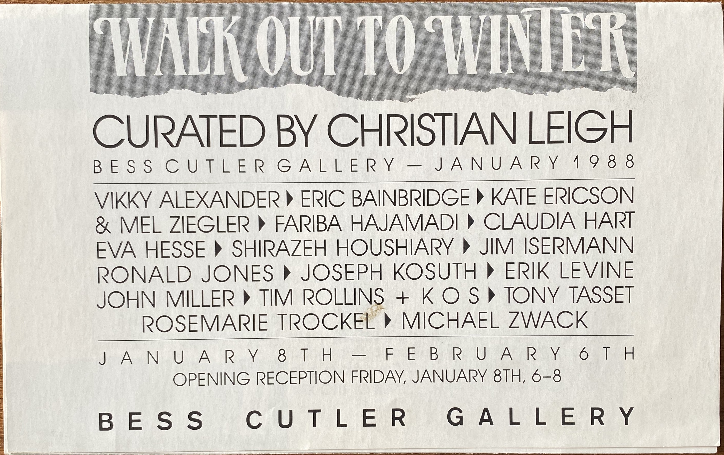 Walk Out to Winter / Glory. Curated by Christian Leigh. Bess Cutler Gallery, New York, January 8 – February 6, 1988