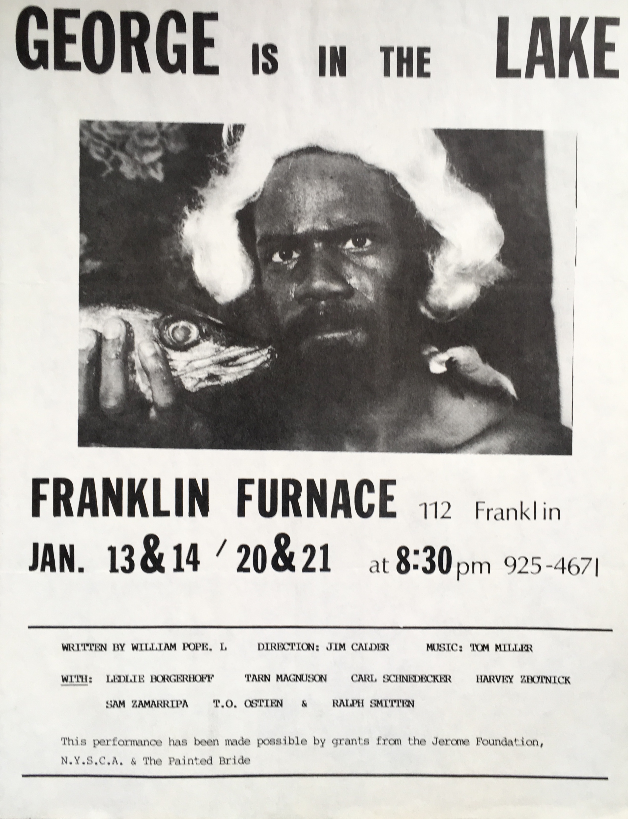 William Pope. L. George is in the lake. Written by William Pope. L. Directions: Jim Calder. Music: Tim Miller. Franklin Furnace, [New York], January 13 & 14, 20 & 21, [1989]