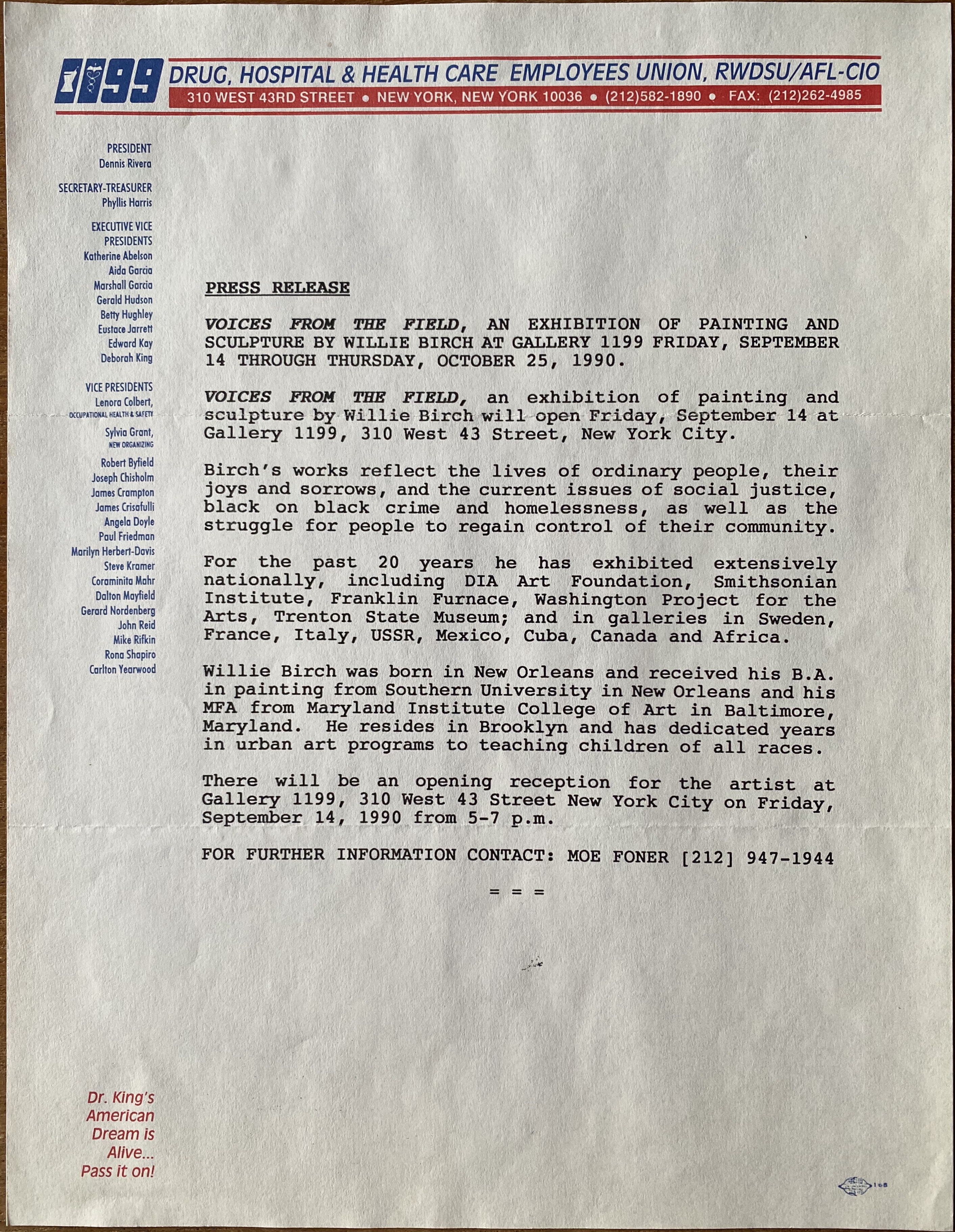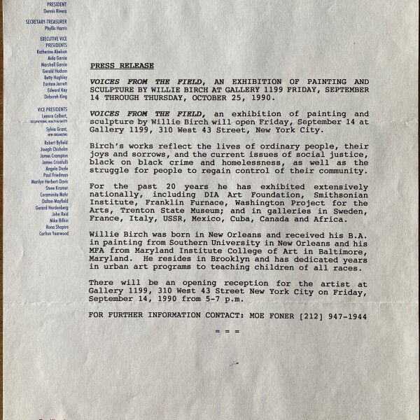 Willie Birch. Voices From the Field. Gallery 1199, New York, September 14 – October 25, 1990