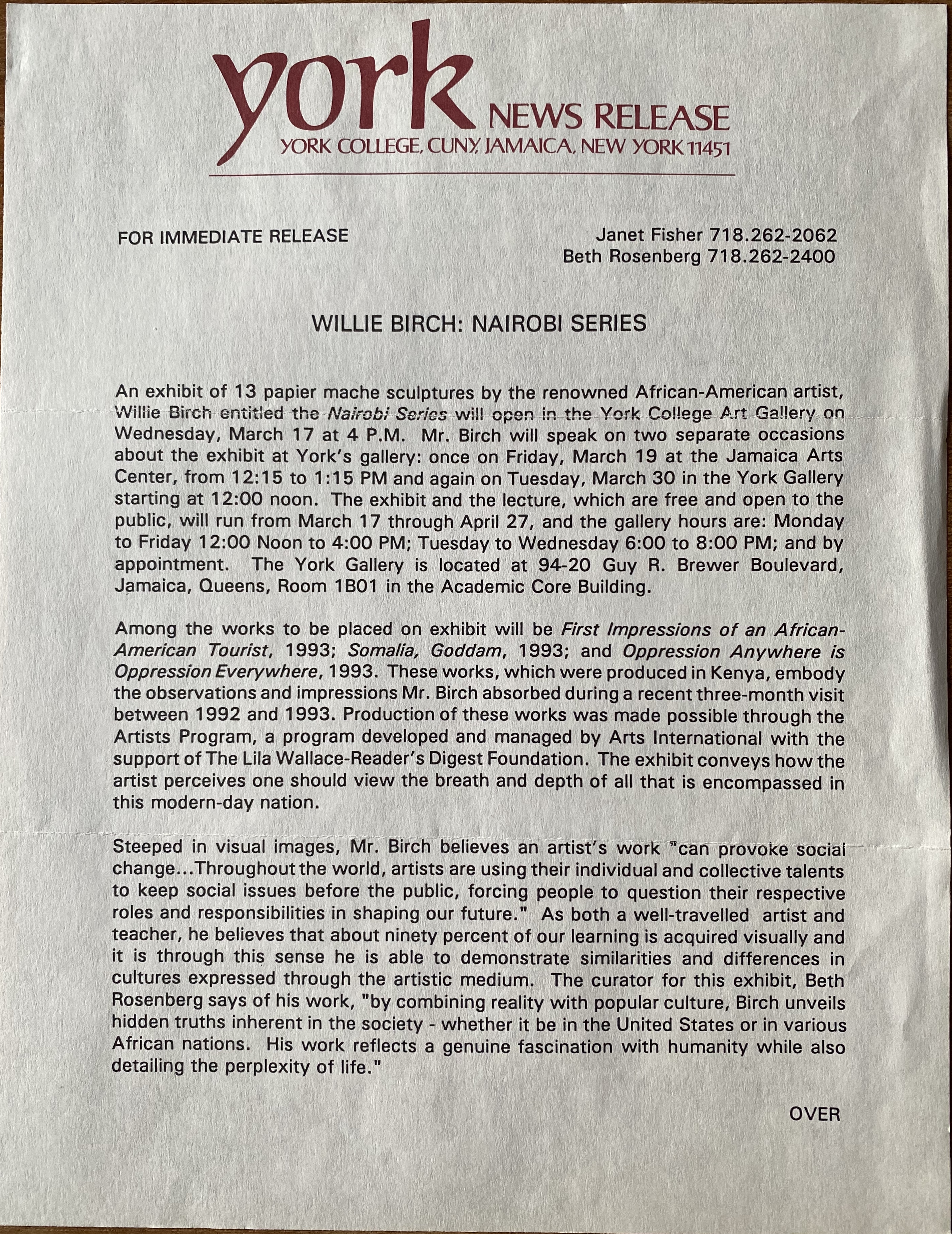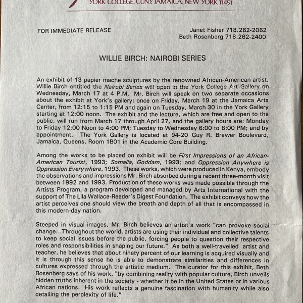 (Willie Birch). Willie Birch: Nairobi Series, York College, SUNY, Jamaica, New York, March 17 – April 27, 1993