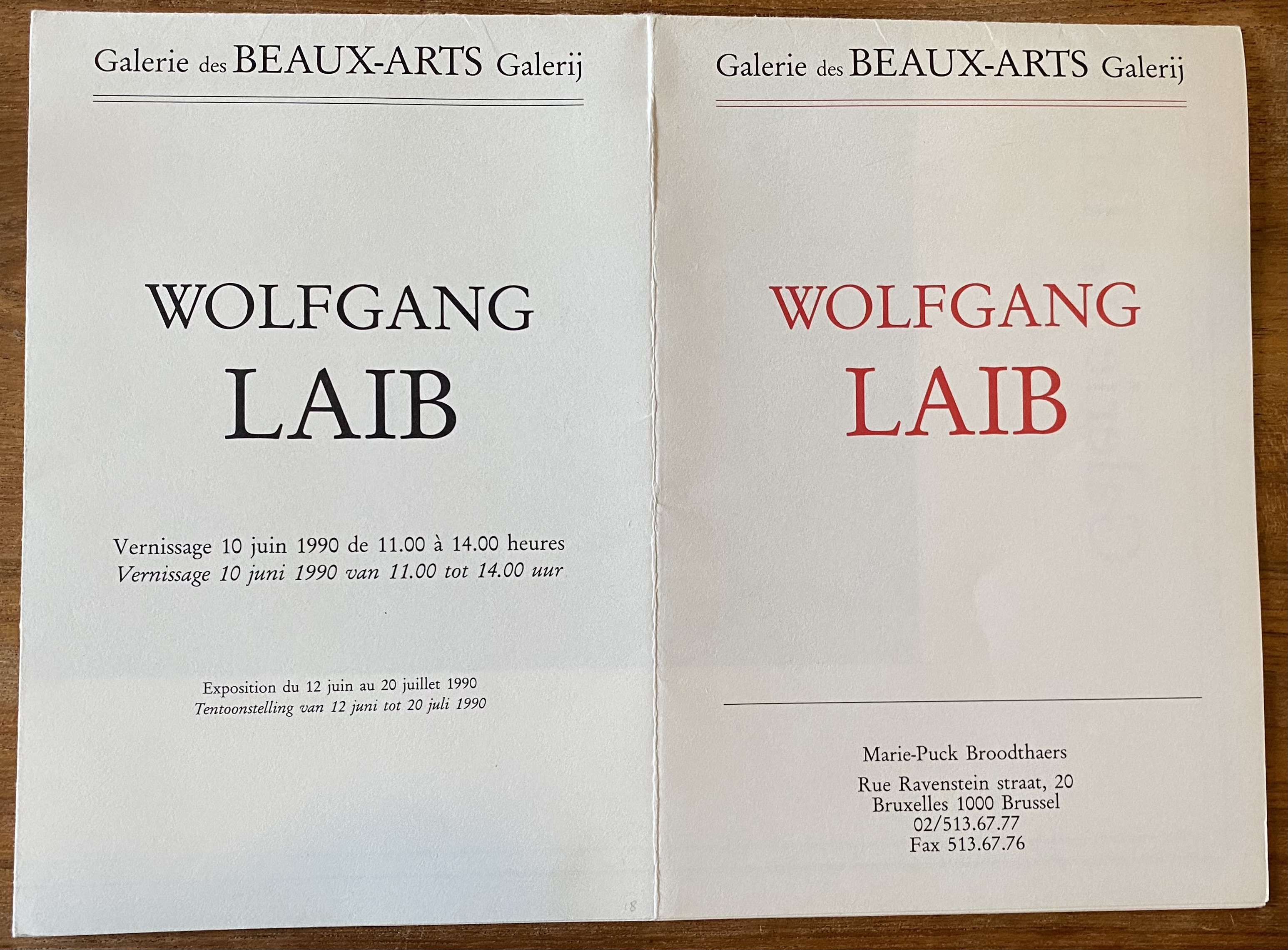 (Wolfgang Laib). Wolfgang Laib. Galerie des Beaux – Arts, BEAUX–ARTS Galerij, Bruxelles / Brussel. Vernissage: 10 juin 1990 / 10 Juni 1990