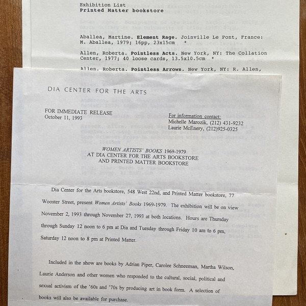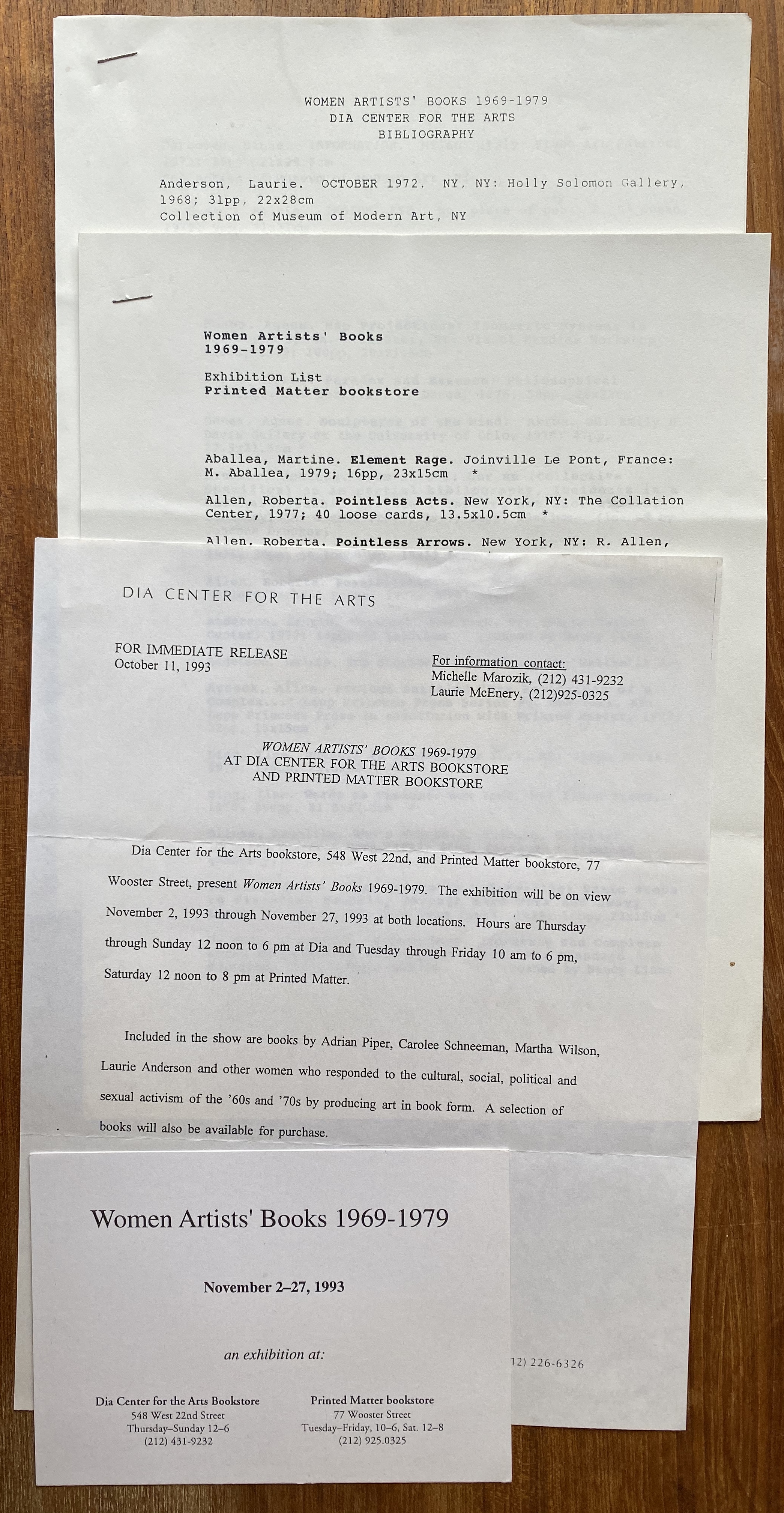 Women Artists’ Books 1969 – 1970. An exhibition at Dia Center for the Artists Bookstore, New York (and) Printed Matter bookstore, New York, November 2-27, 1993
