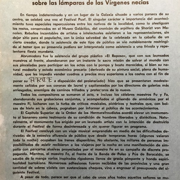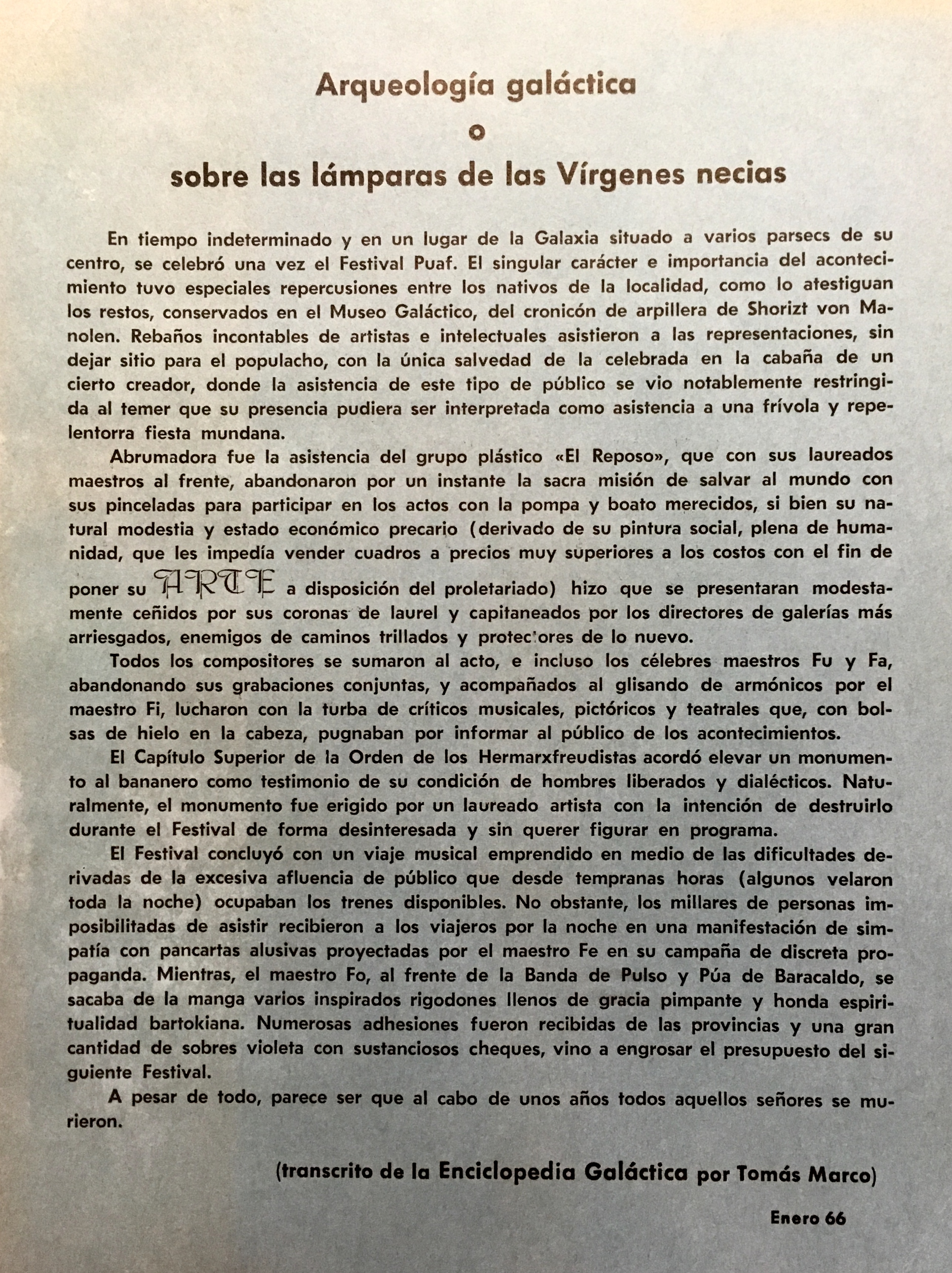 (Zaj). Arqueología galáctica o sobre las lámparas de las Vírgenes necias. (Transcrito de la Enciclopedia Galáctica de Tomás Marco). Enero 1966